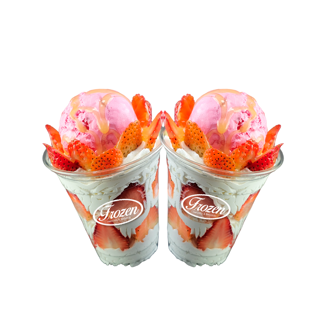 2 Porciones de Helado, Fresas, Cerezas, Salsa de la casa de Frutos rojos, Crema Chantilly. Contenedor de 24 oz.