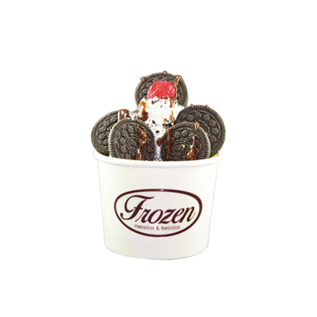 2 Porciones de helado, galleta Oreo, Oreo triturado, cereza, salsa de chocolate y crema chantilly. Contendor de 16 oz.