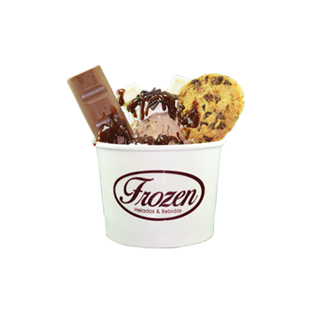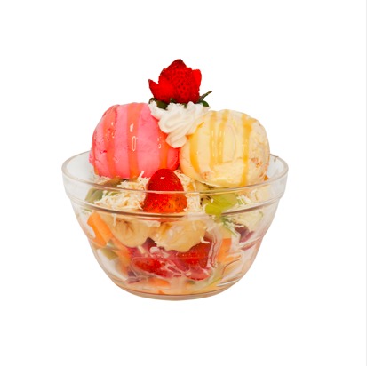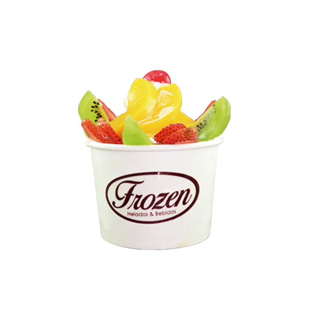 2 Porciones de helado, frutas (durazno, kiwi, fresa, melón, uva, banano, manzana verde, mango), crema de leche, leche condensada, crema chantilly. Contenedor de 24 oz.
