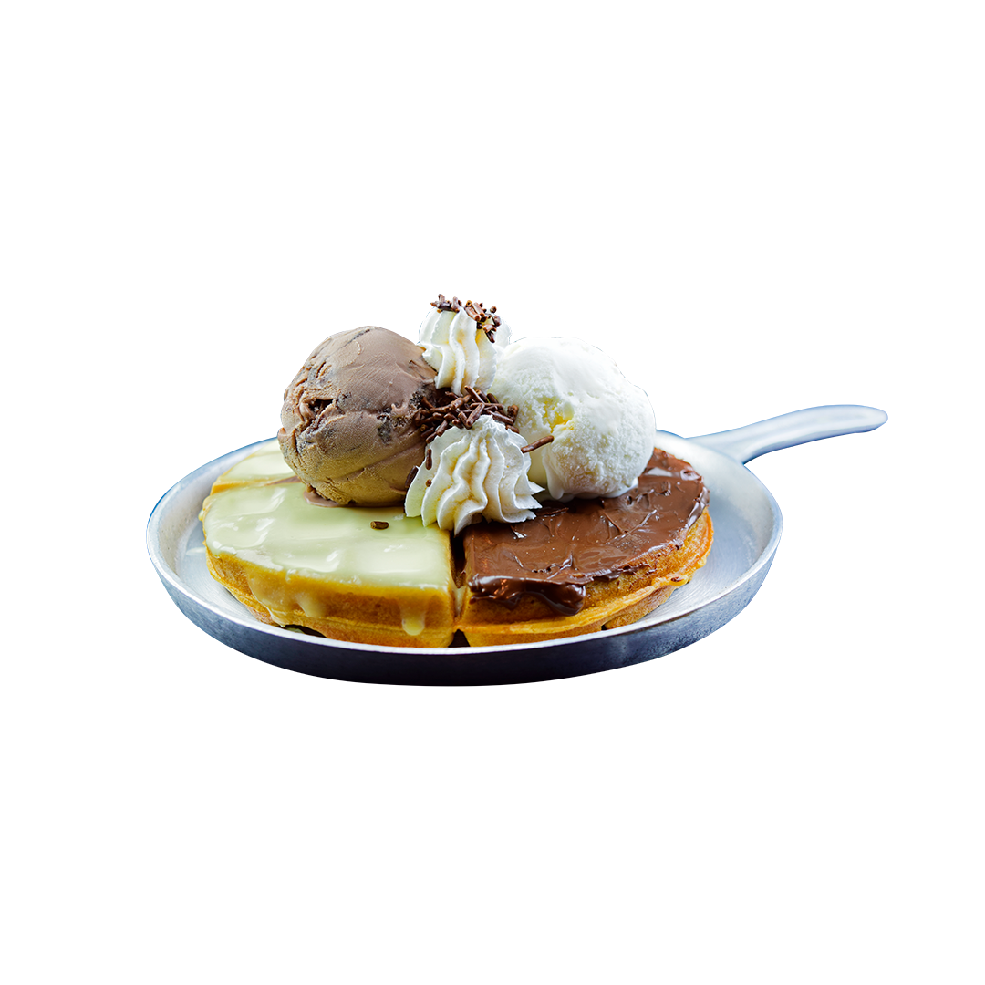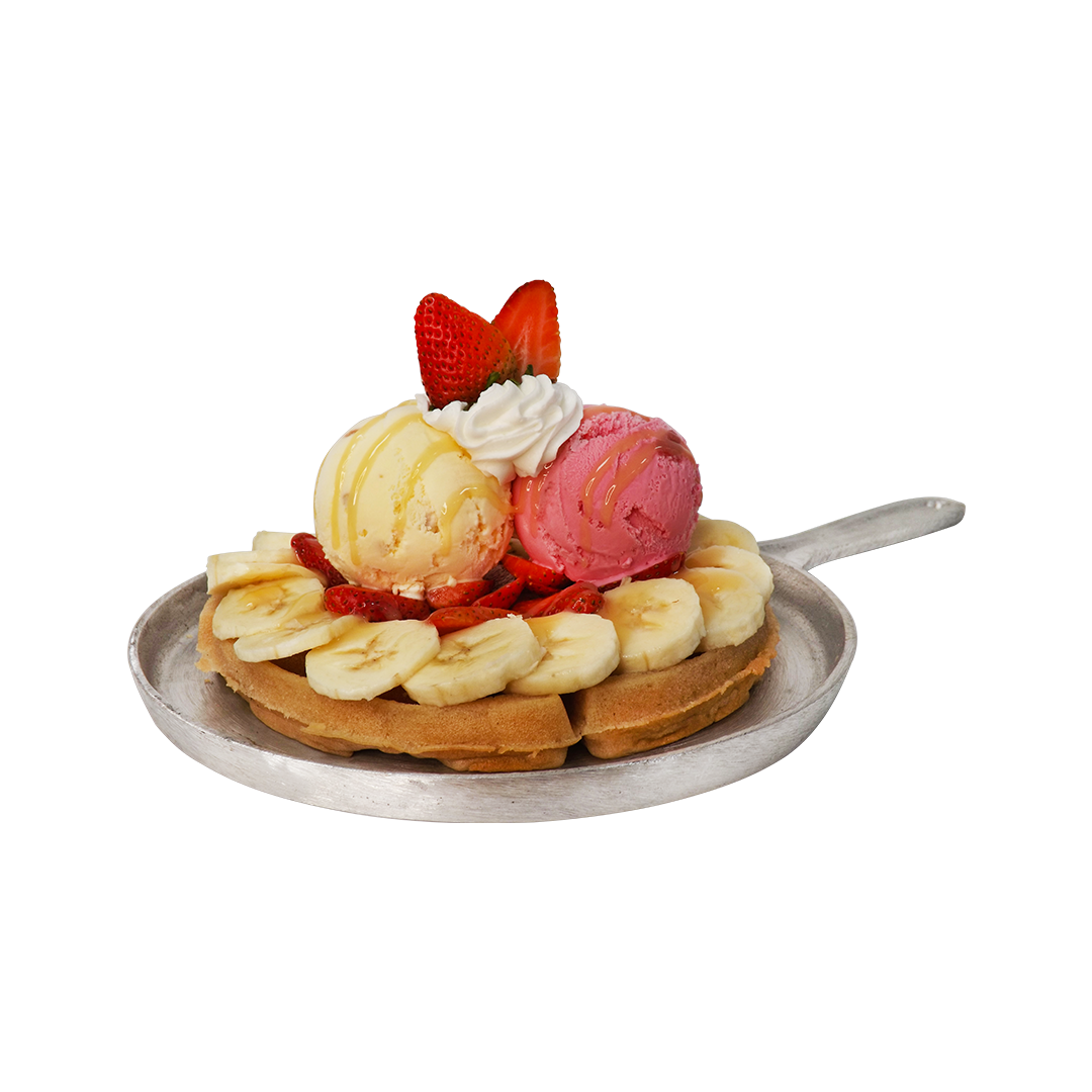 Waffle, 2 Porciones de Helado, Mix de frutas (Fresa, Banano), Leche Condensada, Crema Chantilly.