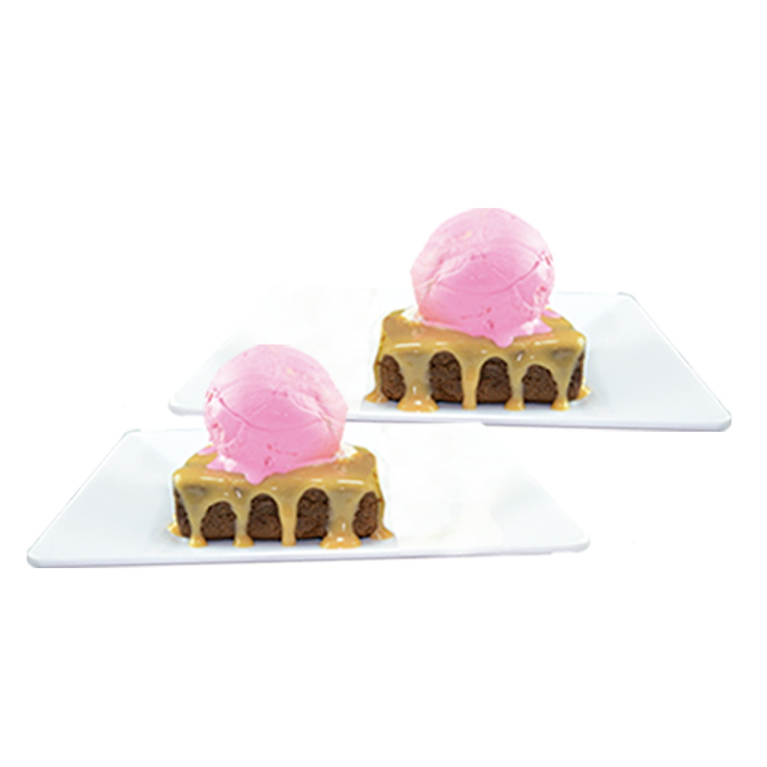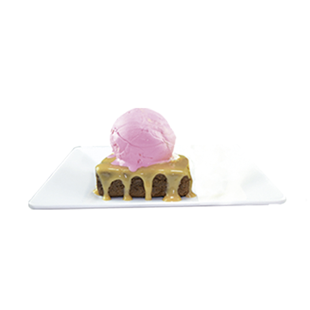 Brownie de la casa caliente, 1 porción de helado, sobrecarga de salsa de arequipe. Contenedor de 16 oz.