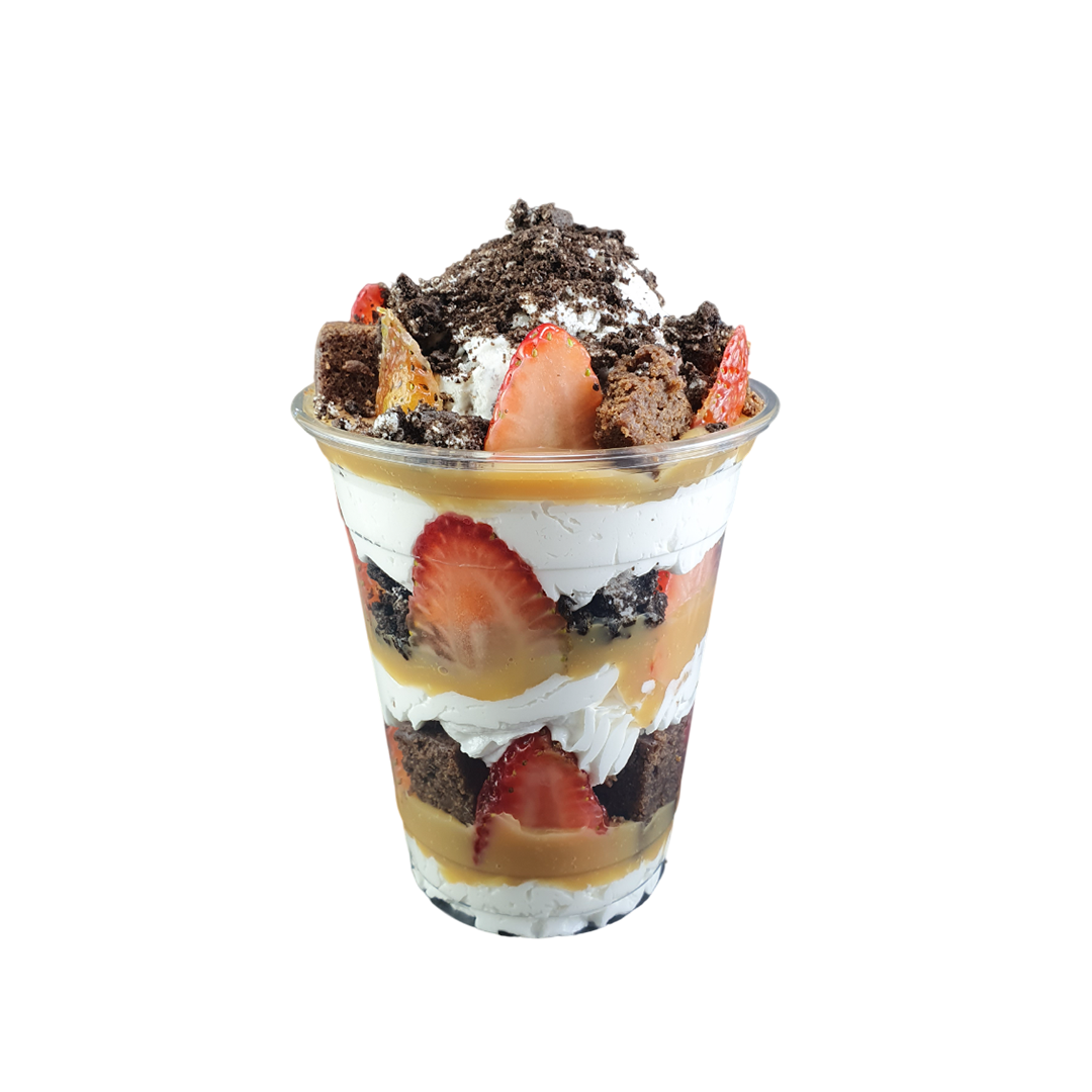 Fresas, 1 Porción de Helado, Crema Chantilly, Brownie, Galleta Oreo, ArequipeVaso de 12 oz.