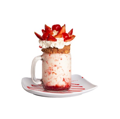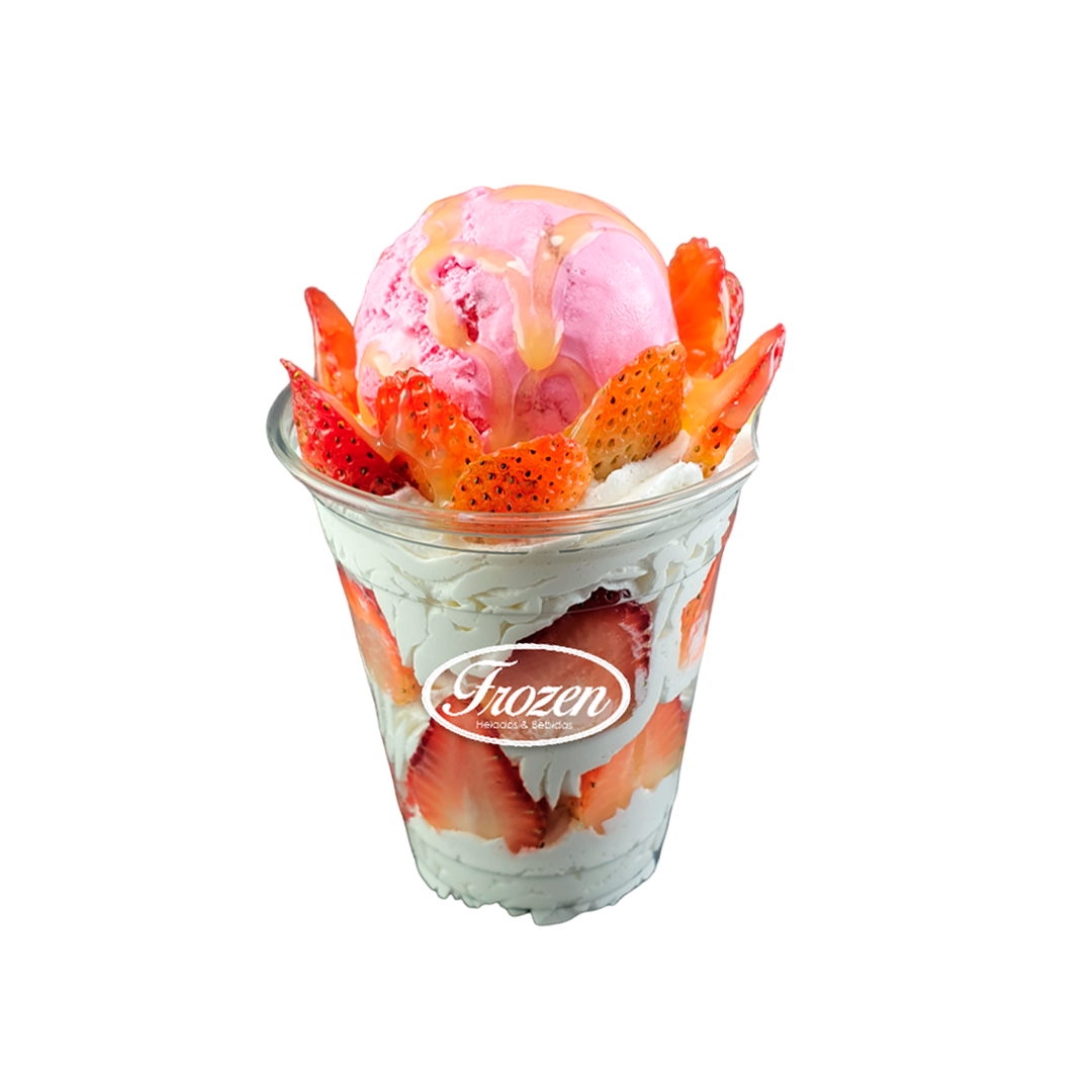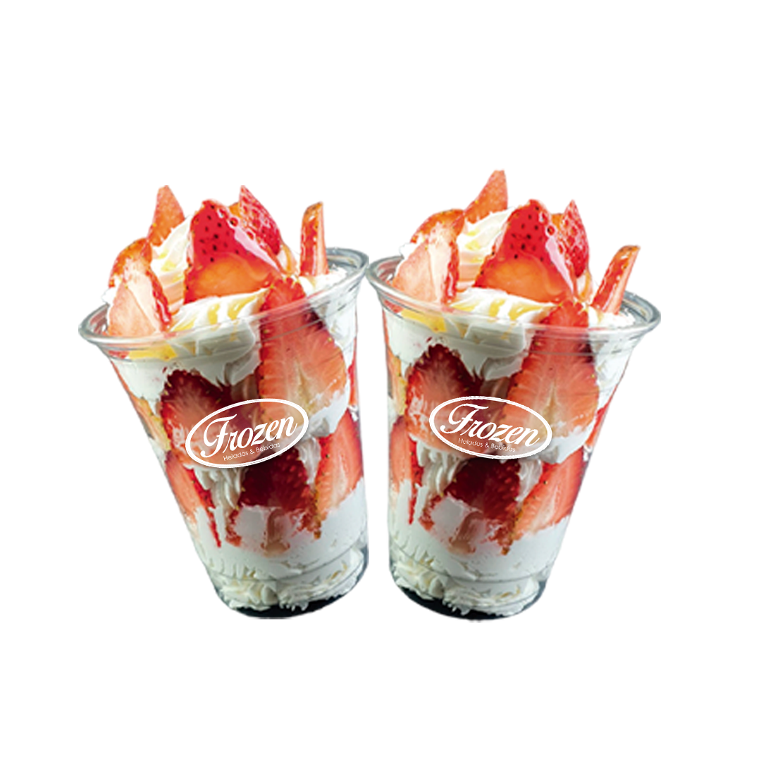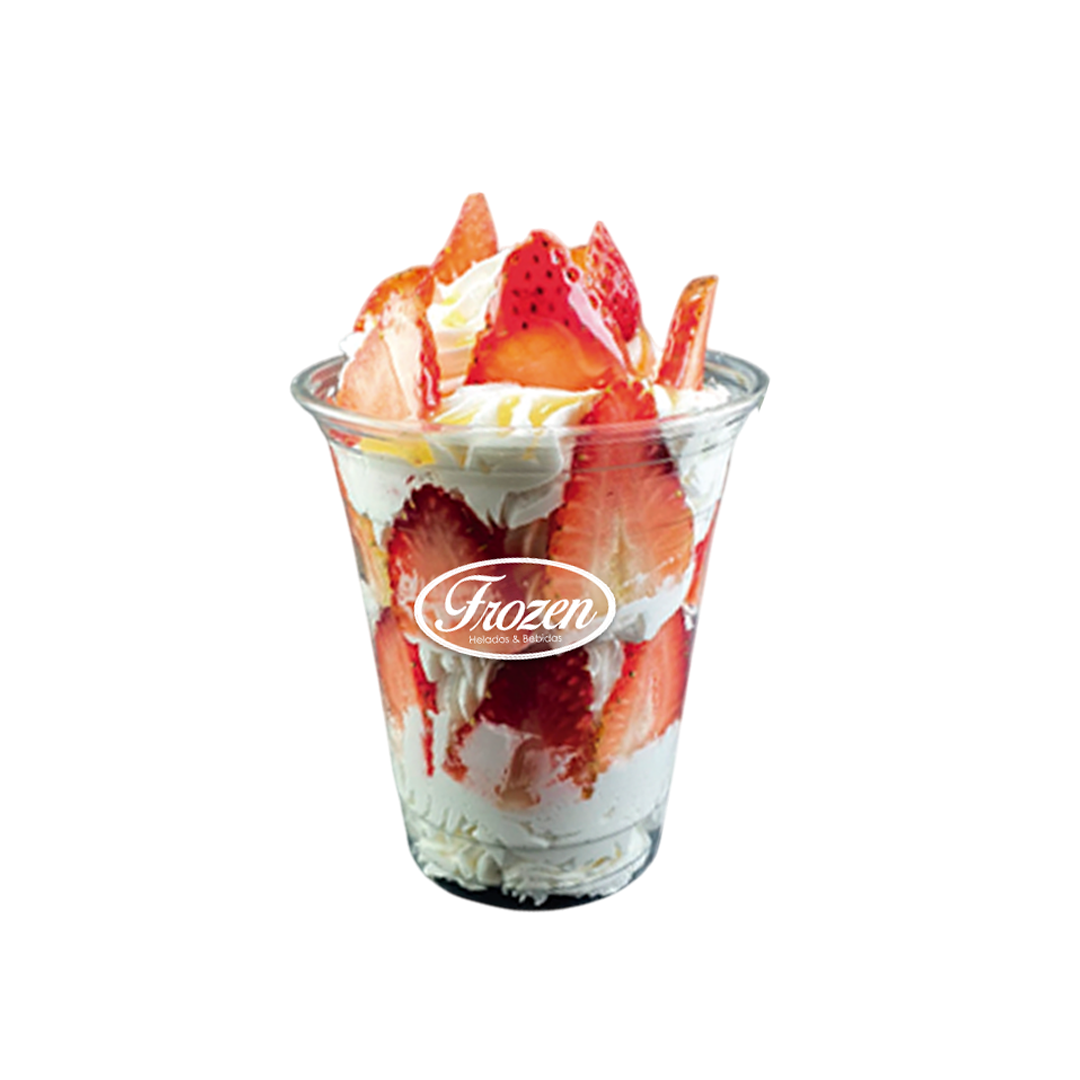 Fresas frescas, crema de la casa, leche condensada. Vaso 12 oz.