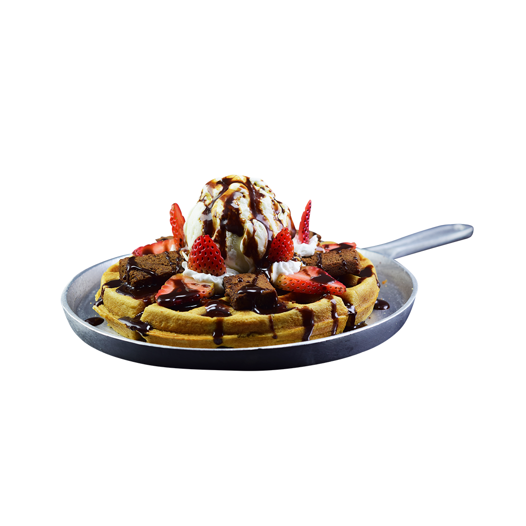 Waffle, 1 Porción de Helado, Hershey´s, Brownie de la casa, Fresas, Crema Chantilly.