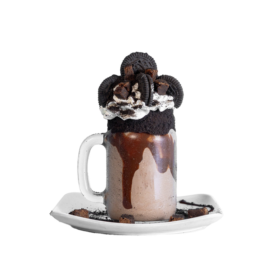 Helado Batido, Crema Chantilly, Brownie de la casa, Galleta Oreo, Salsa de Chocolate, Borde Oreo triturado.
