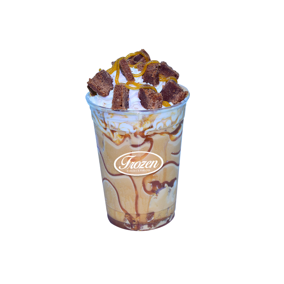 Frappe de café mezclado con arequipe y leche en polvo, sobrecarga de crema chantilly, sobrecarga de arequipe, brownie de la casa en trozos.