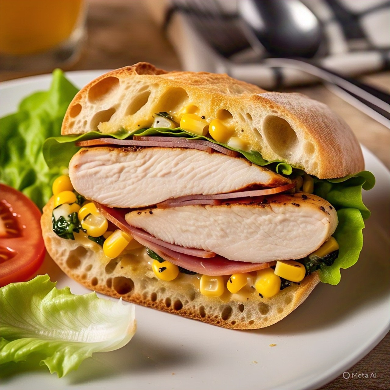 Delicioso pan artellano tostado a la parrilla, relleno de jamón premium, queso americano y maíz, lechuga, tomate, cebolla y nuestra especial salsa de la casa.