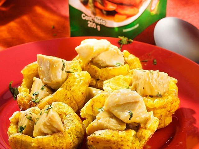 3 Unidades de plátano verde en forma de canastas, rellenas de pechuga de pollo grill, salteado, queso costeño, chongo y nuestra deliciosa salsa de la casa.