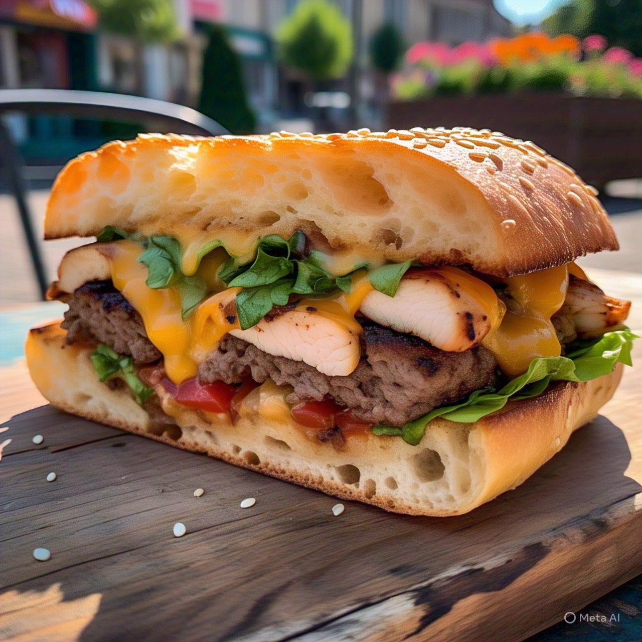 Delicioso pan artellano tostado a la parrilla, relleno pechuga de pollo, carne hecha al grill, queso americano, lechuga, tomate, cebolla y nuestra especial salsa de la casa.