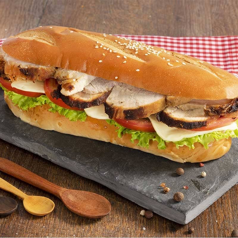 Delicioso pan artellano tostado a la parrilla, relleno de bondiola de cerdo hecha al grill, queso americano, lechuga, tomate, cebolla y nuestra especial salsa de la casa.
