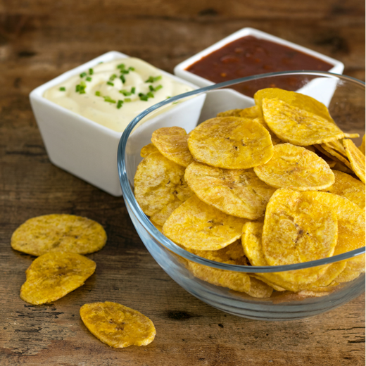 Dips de monedas de plátano verde, acompañado de nuestra salsa especial de la casa y delicioso queso costeño rallado.
