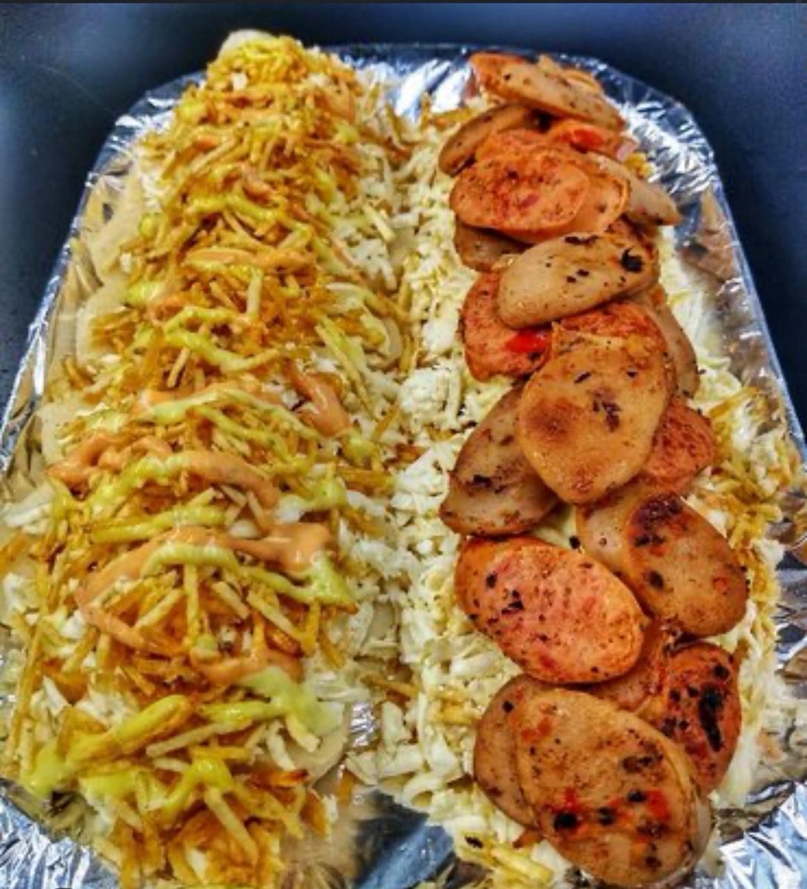 Doble porción de patacón, ambas hechas con plátano verde frito, acompañado de pechuga de pollo, salchicha, chorizo, butifarra hecho al grill, lechuga, chongo, queso costeño y nuestra especial salsa de la casa.