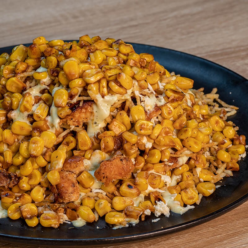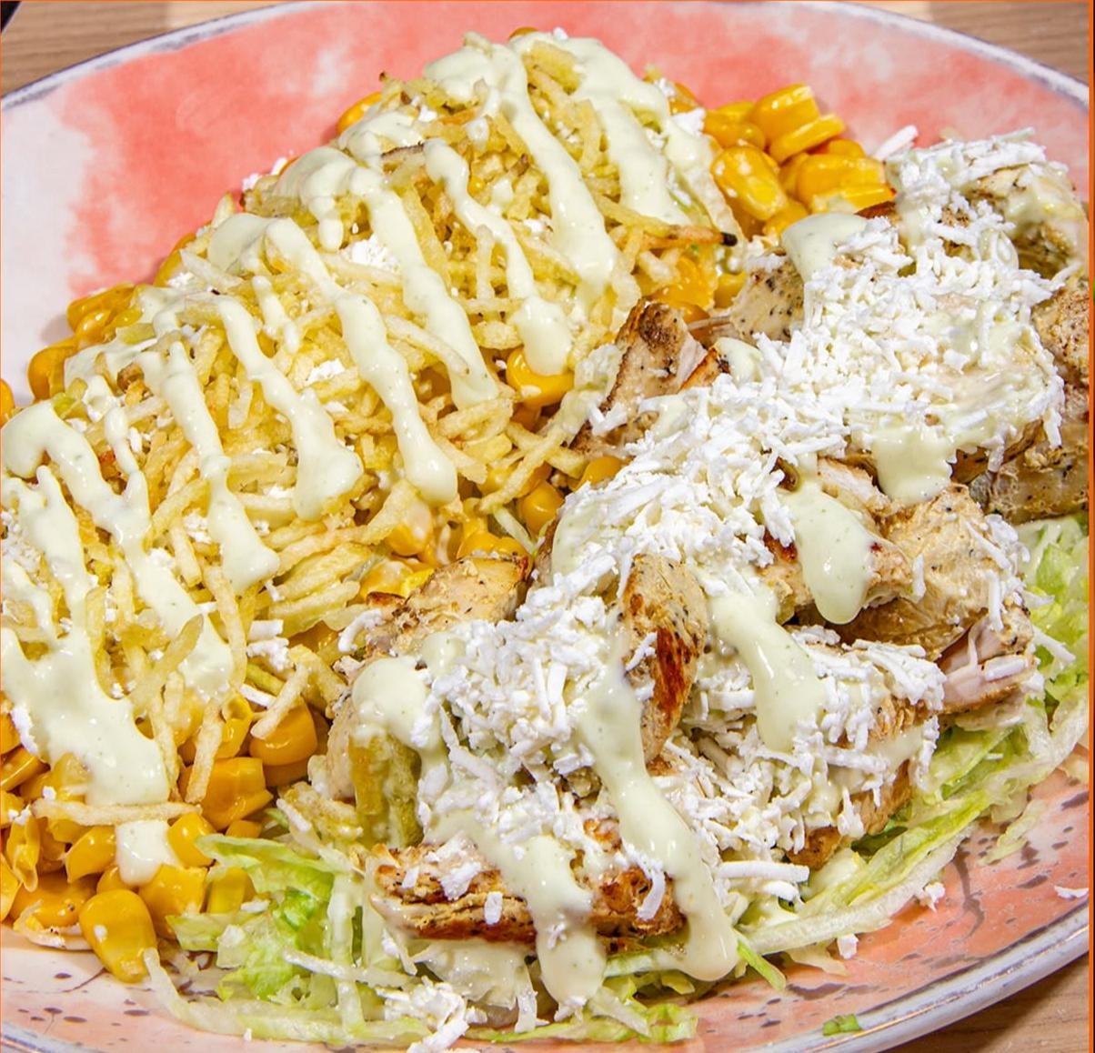 150 g De maíz dulce, acompañado de pechuga de pollo grill, lechuga, queso costeño, chongo y salsas de la casa.