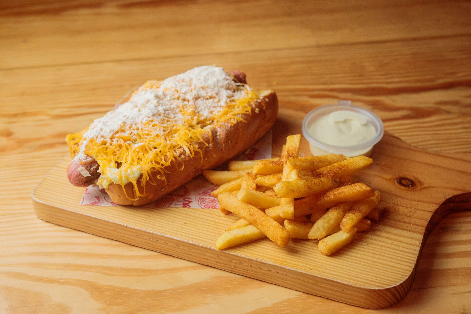 Pan artesanal, lechuga, 200 g de proteína a elección (carne o pollo), tocineta, maíz, aguacate, queso mozzarella rallado, papitas ralladas y salsas de la casa.