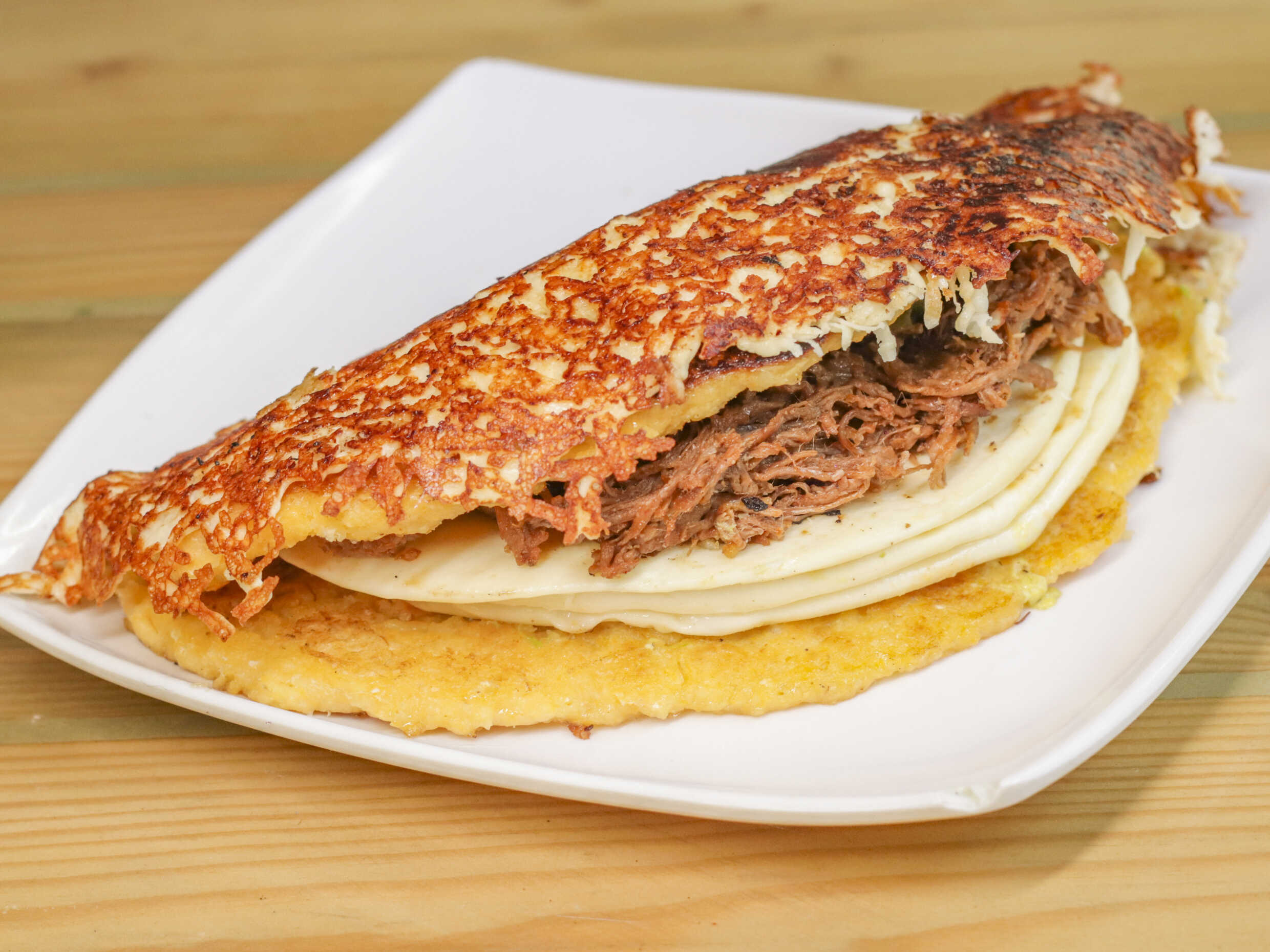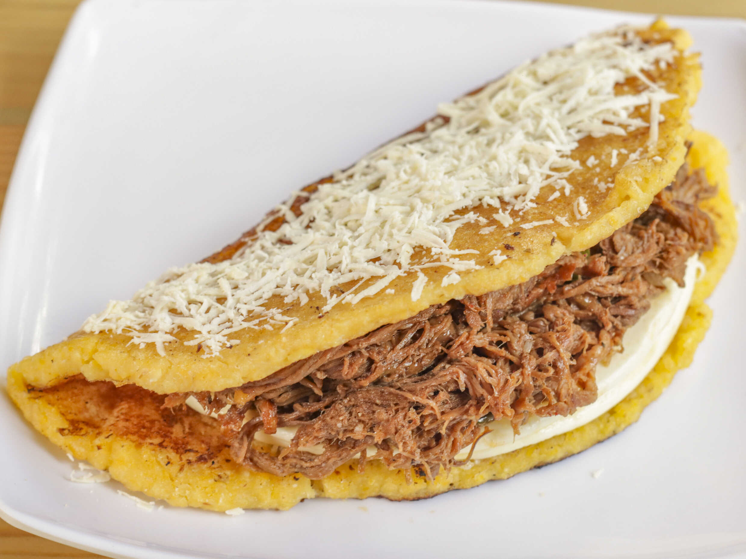 Arepa venezolana con carne desmechada y queso cheddar premium rallado.