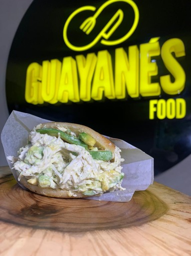 Mantequilla, queso mano o guayanés, pollo desmechado, combinada con crema de aguacate.