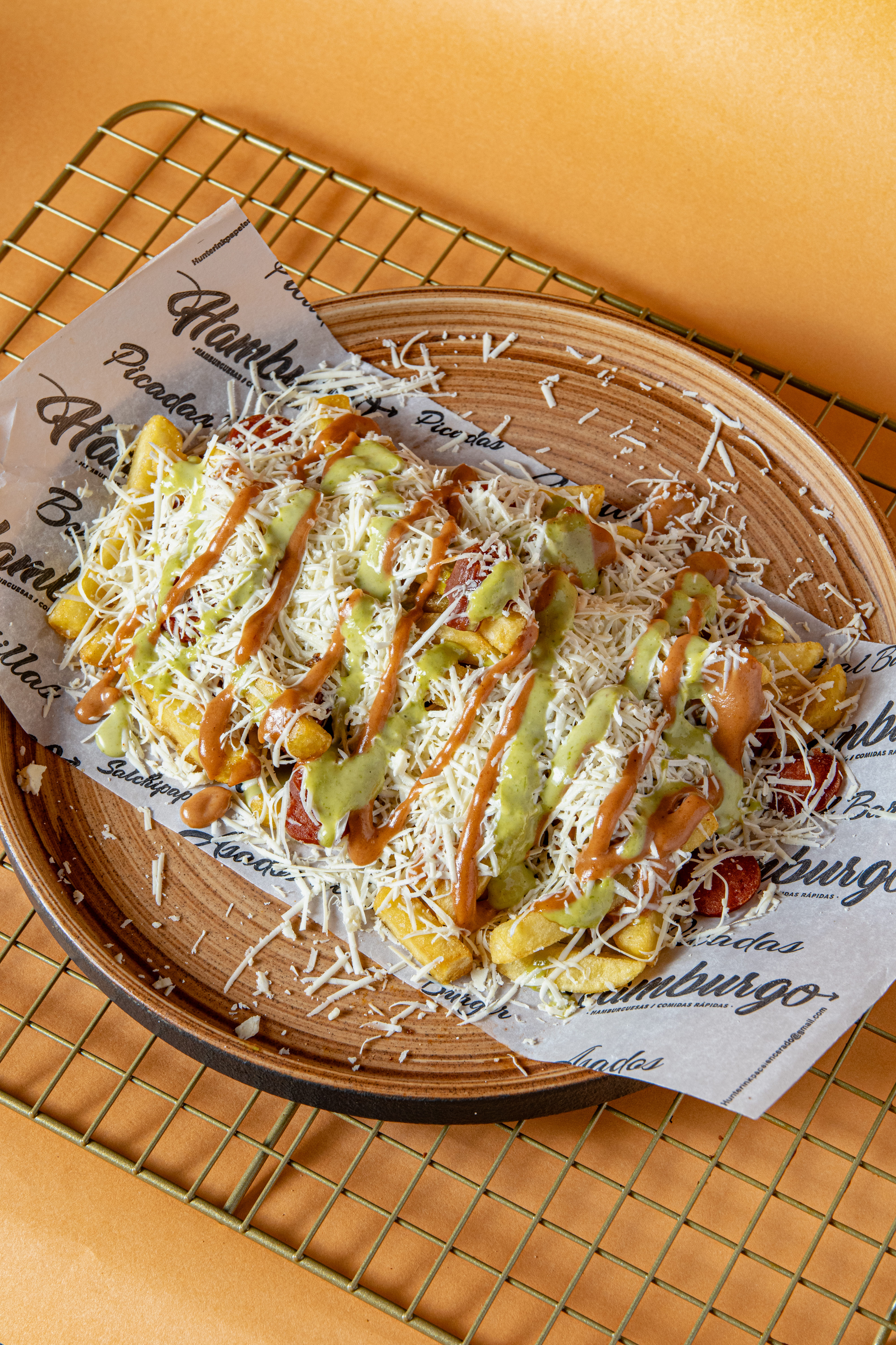 Papas francesas, salchicha tipo Ranchera, pollo, lechuga, queso costeño, chongo y salsas.