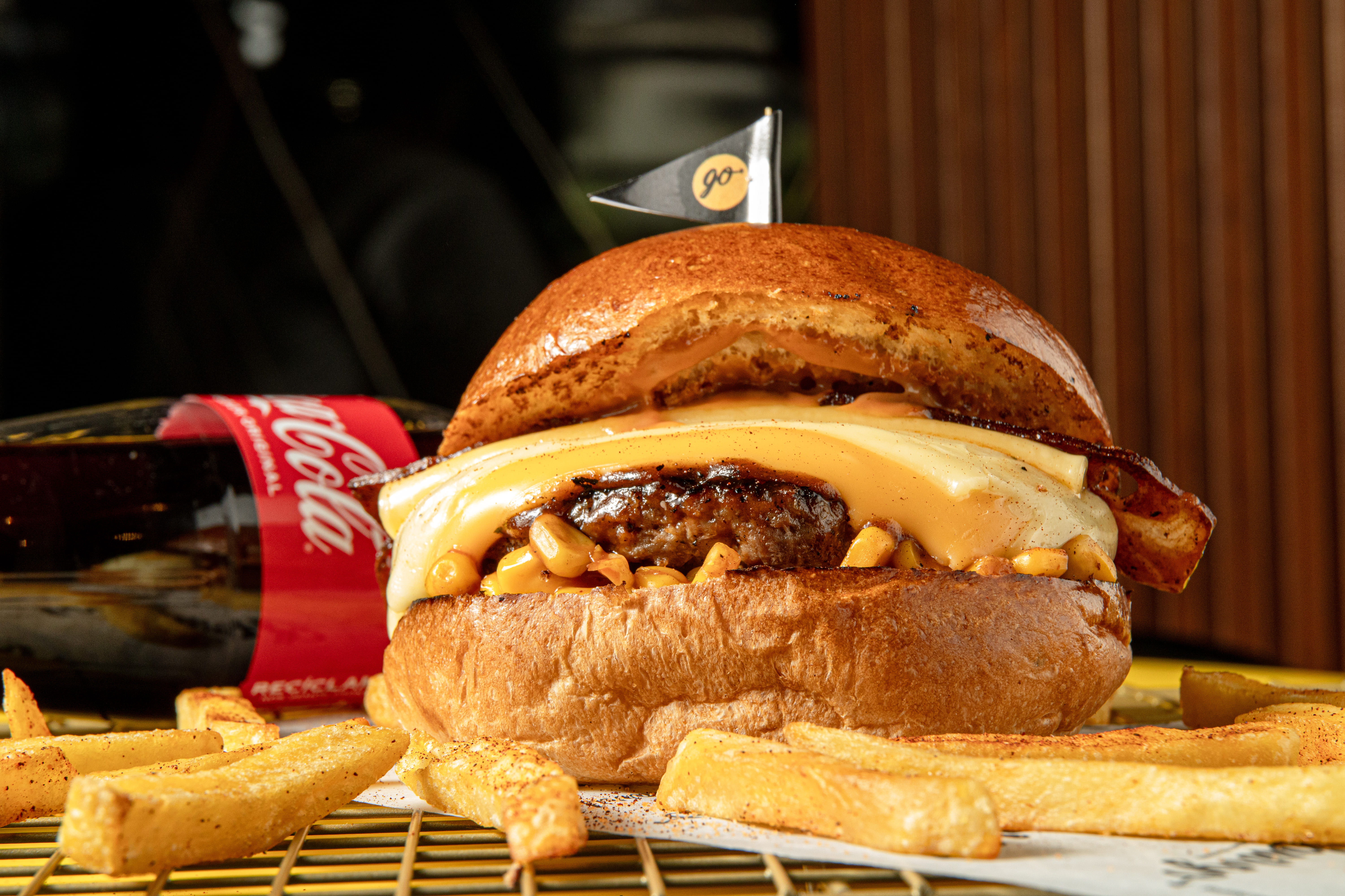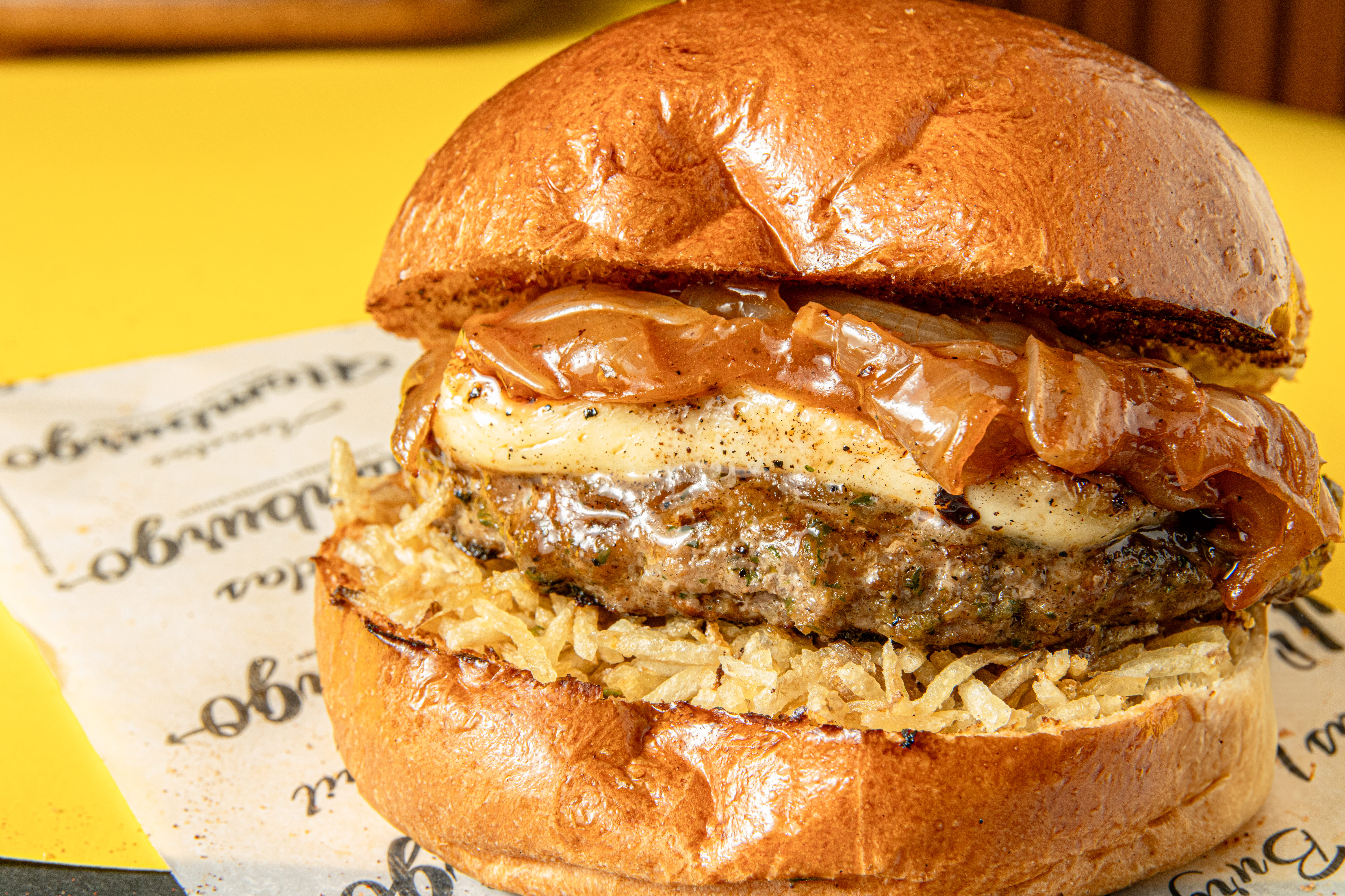 Hamburguesa con carne artesanal, mozzarella, tocineta, papa chongo, cebolla grilled y salsa de la casa, no lleva papas a la francesa.