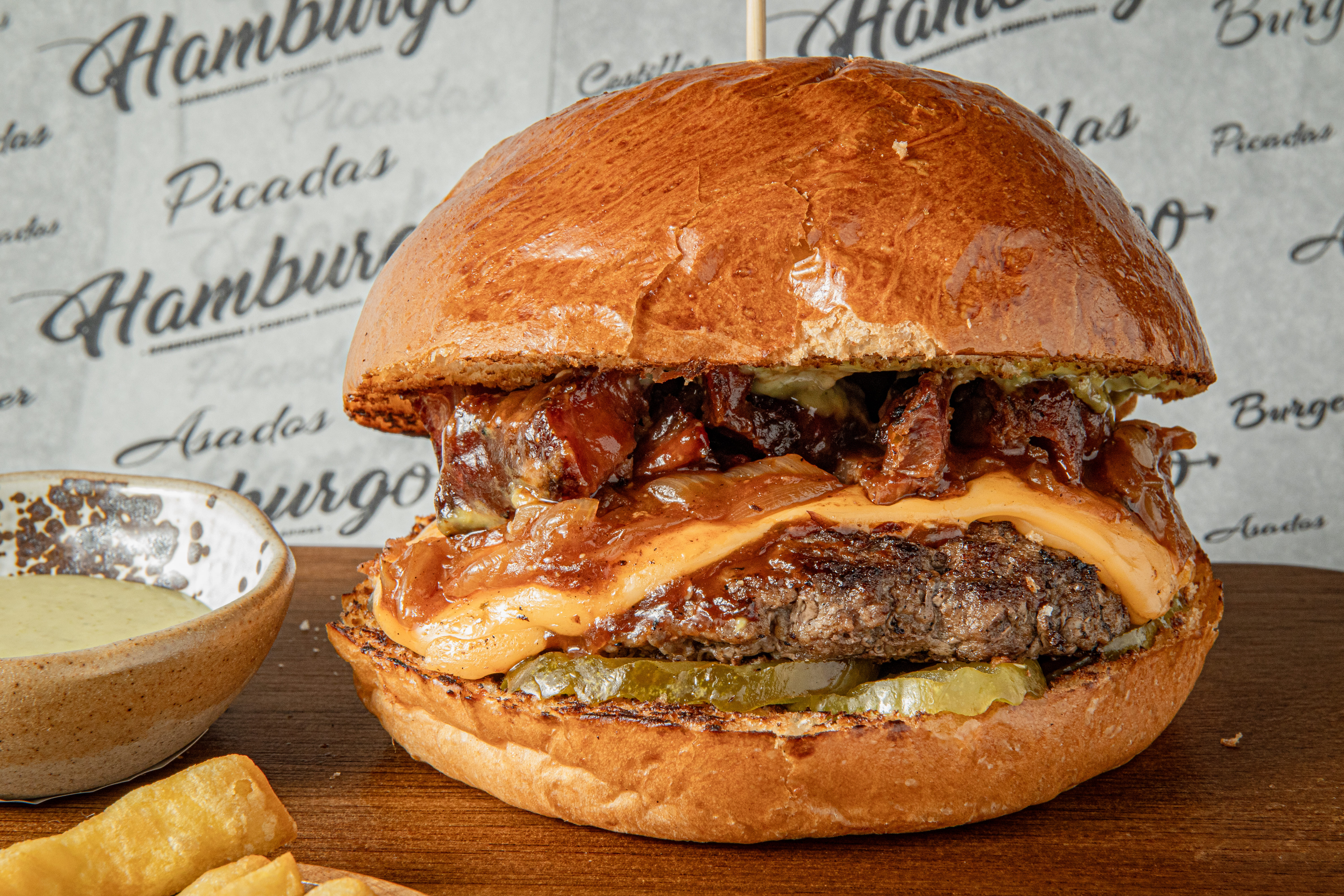 Pan artesanal, carne angus, pepinillos agridulces, queso cheddar, trozos de costilla en BBQ, cebolla caramelizada y salsa de la casa.