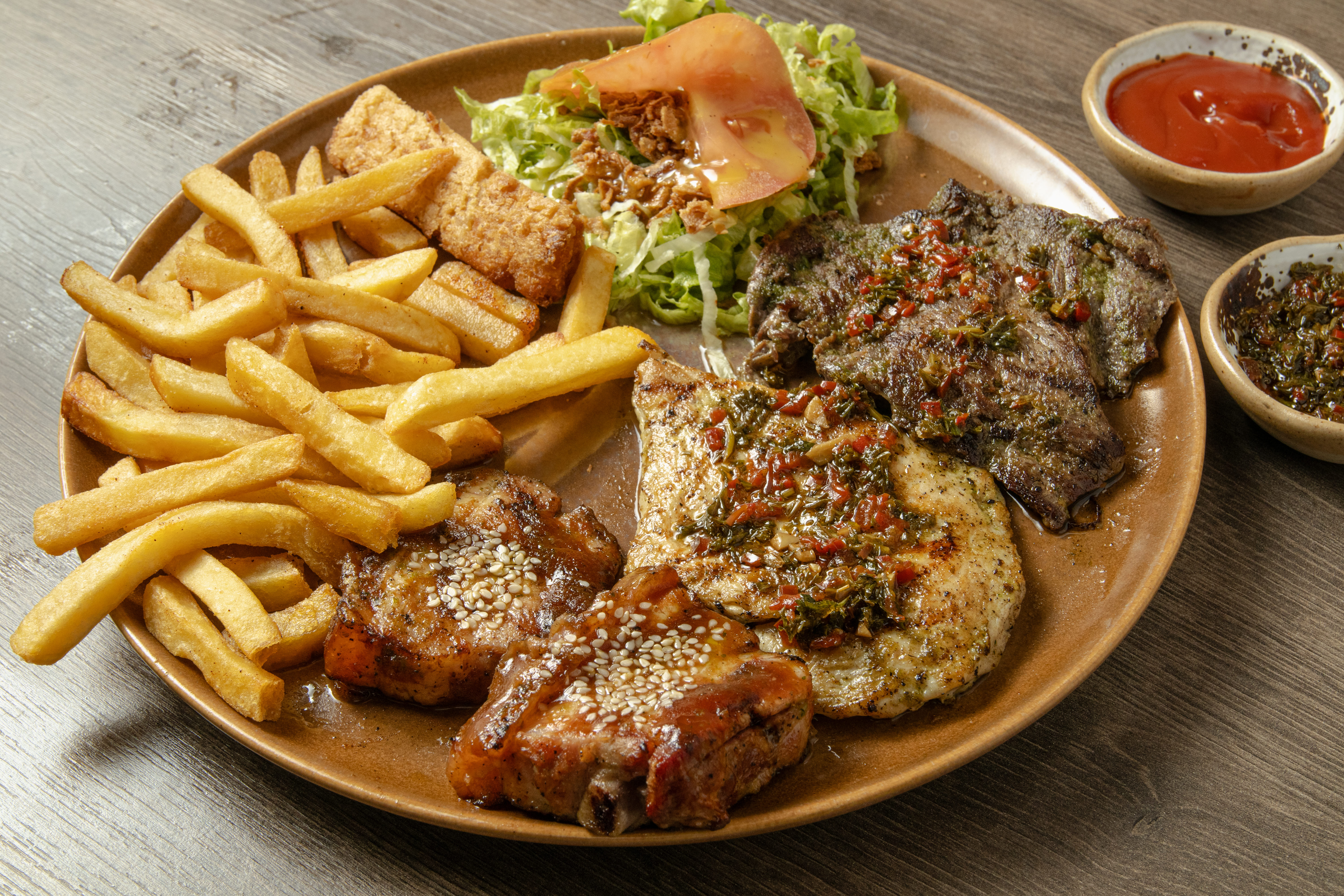 Delicioso lomo ancho, pechuga asada, costilla de cerdo al barril, papa francesa, croqueta de yuca, ensalada, chimichurri y tártara.