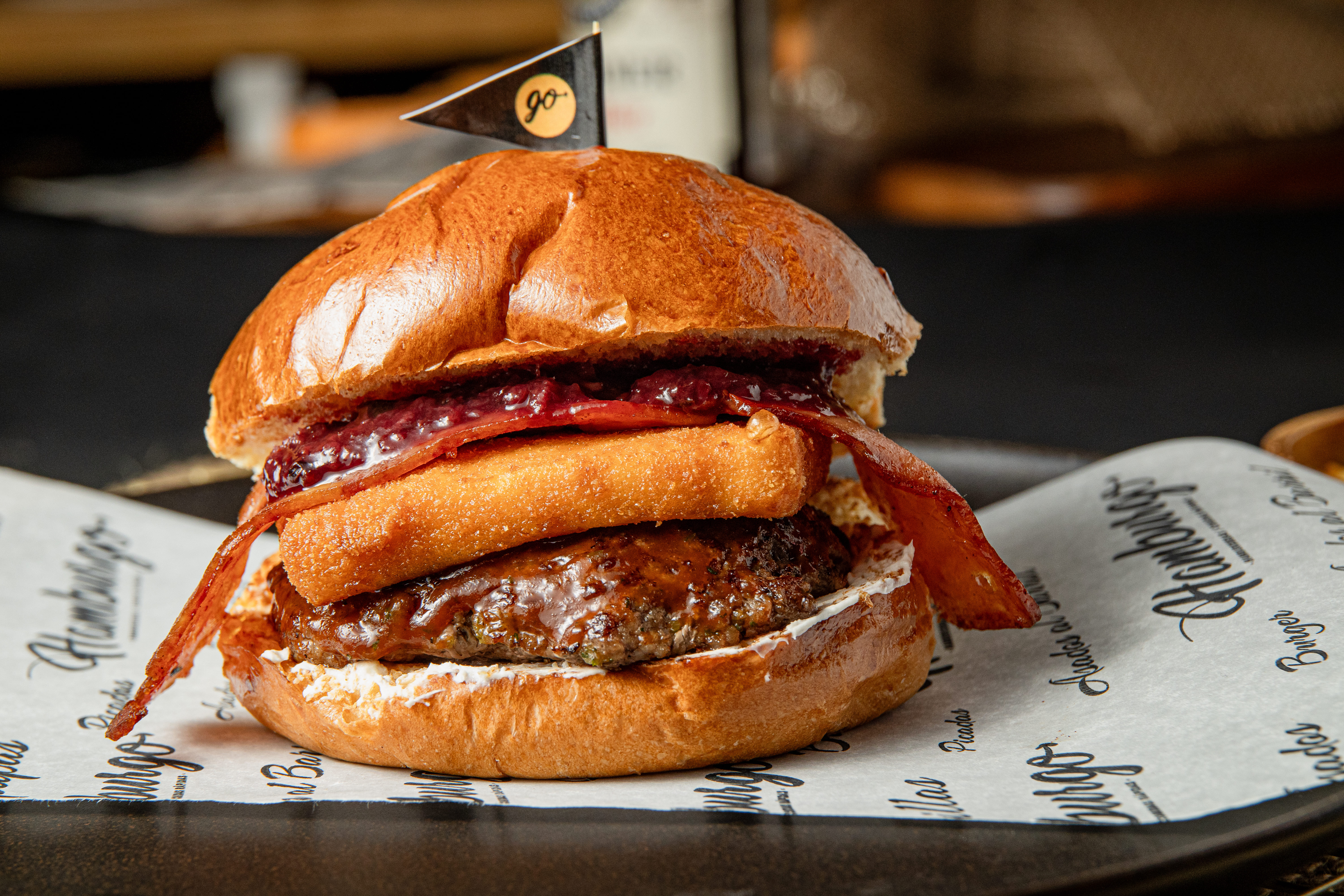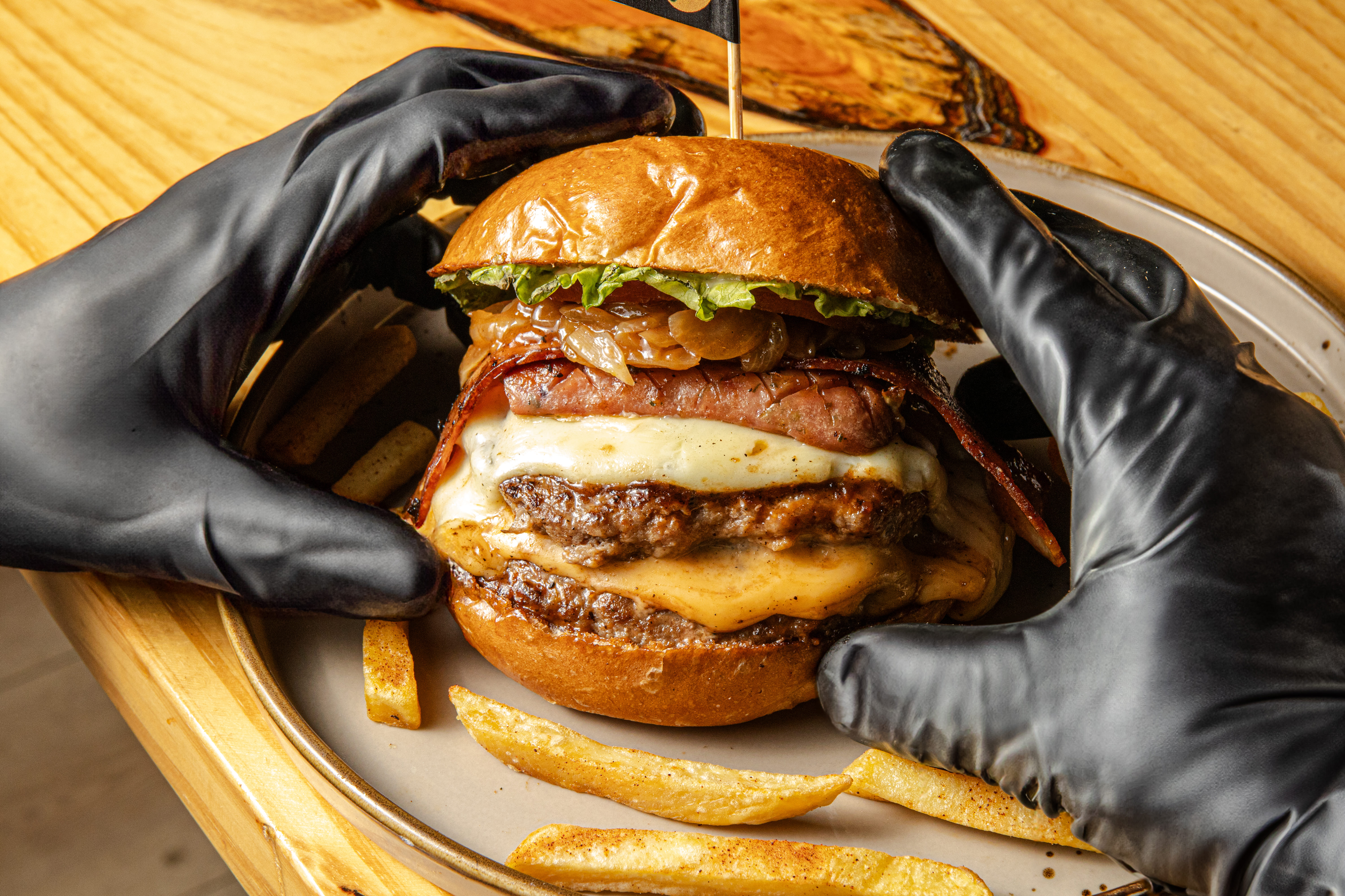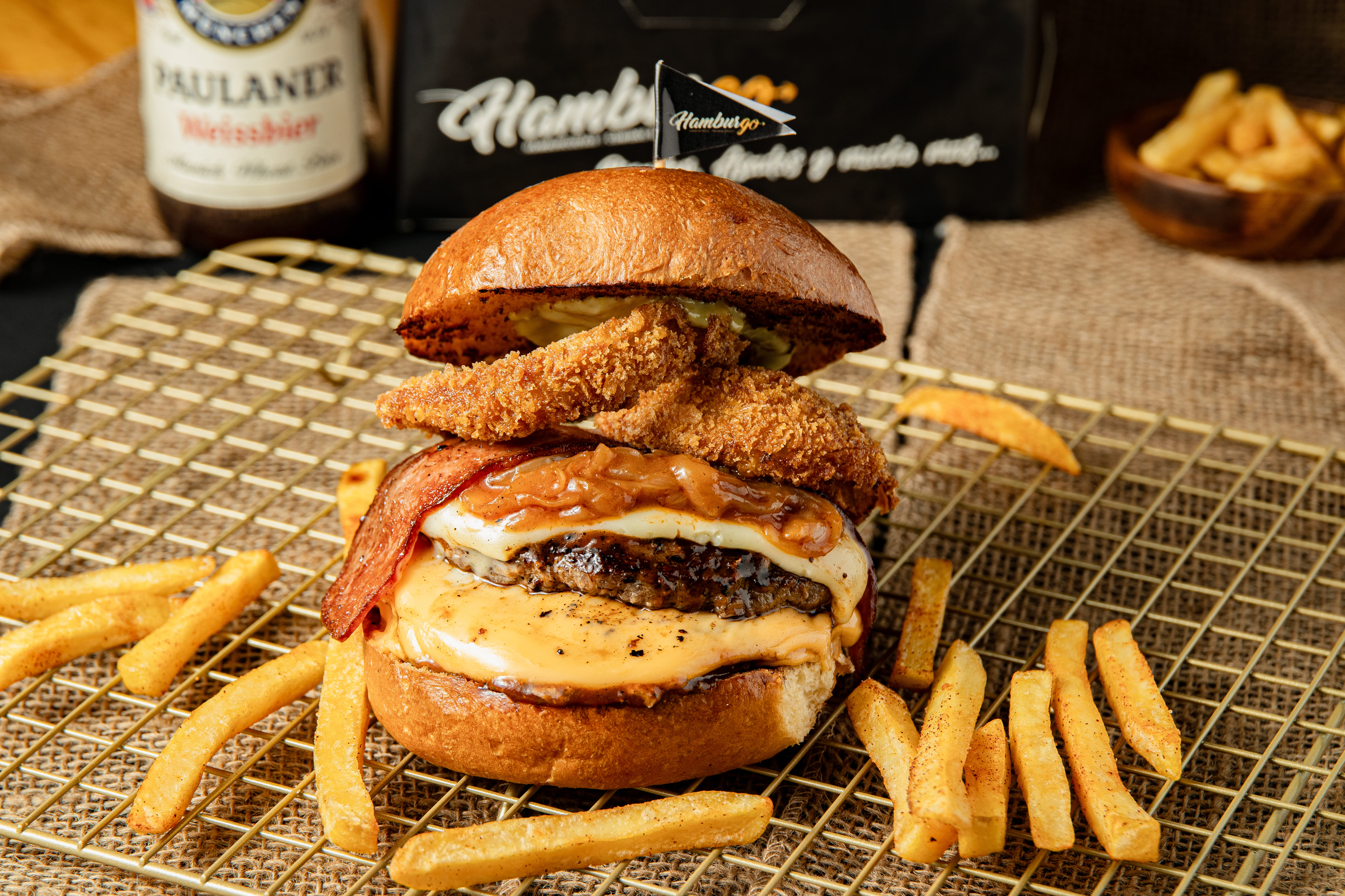 Doble carne artesanal, tocineta crocante, aros de cebolla crocantes, queso mozzarella, queso cheddar, cebolla grilled.