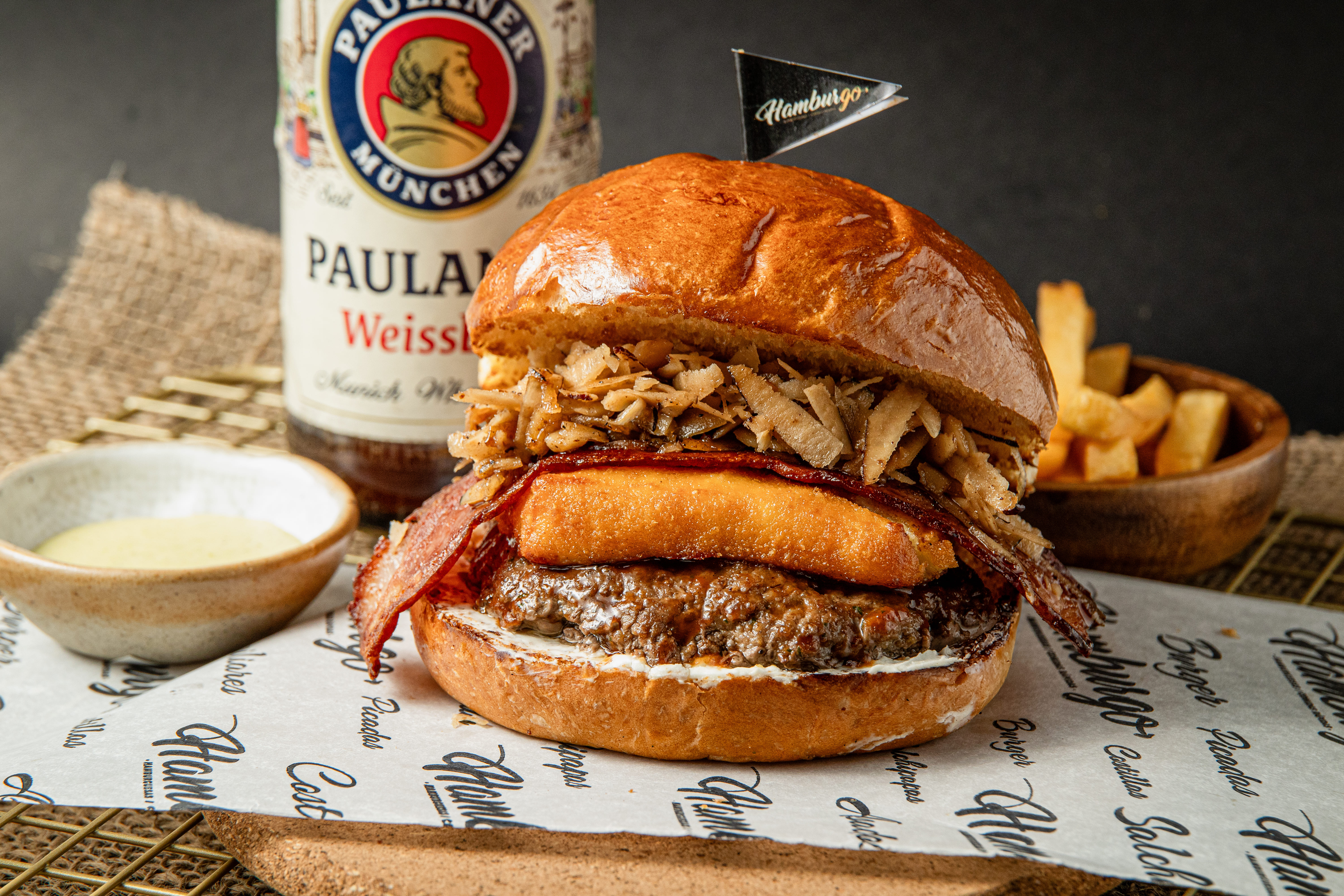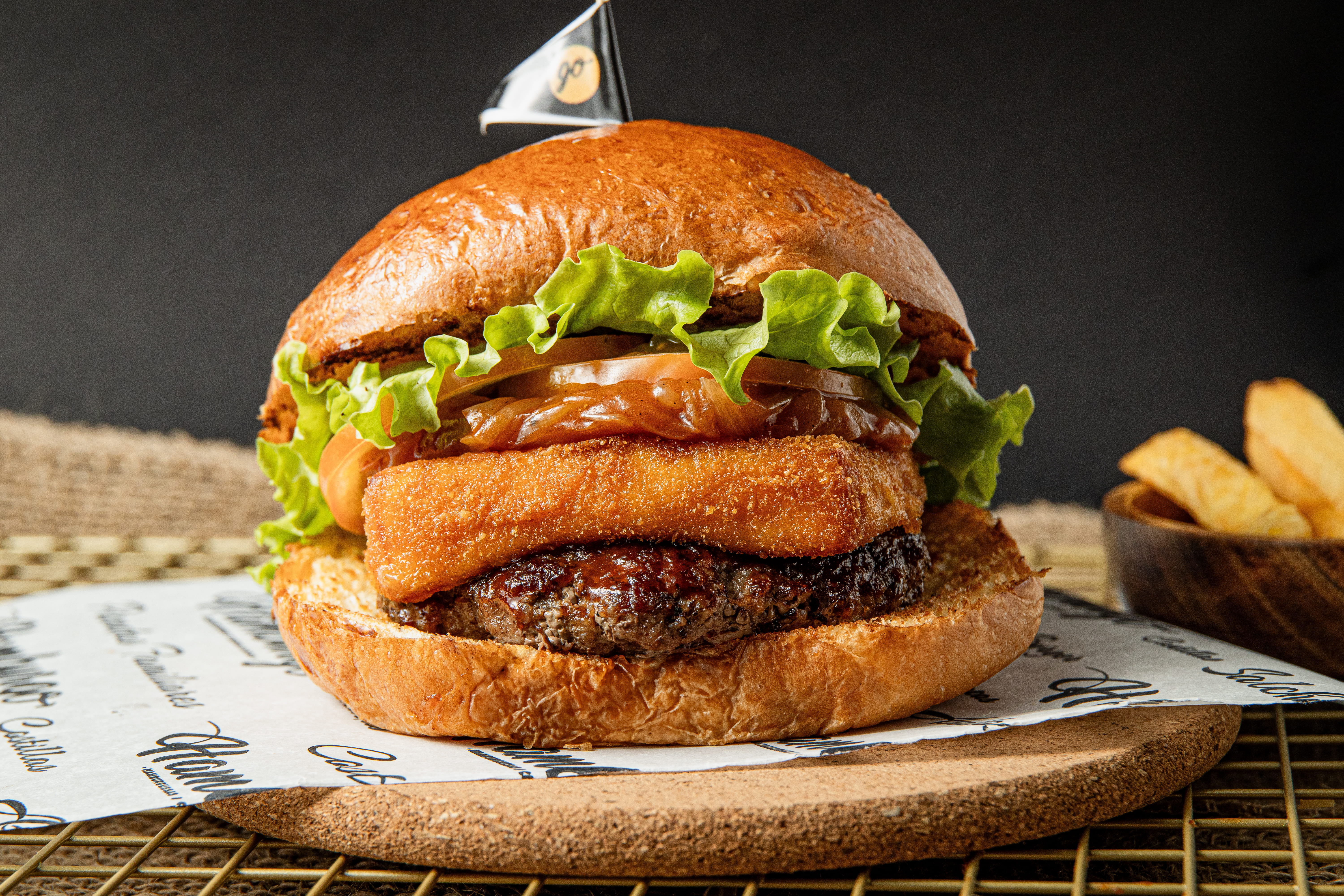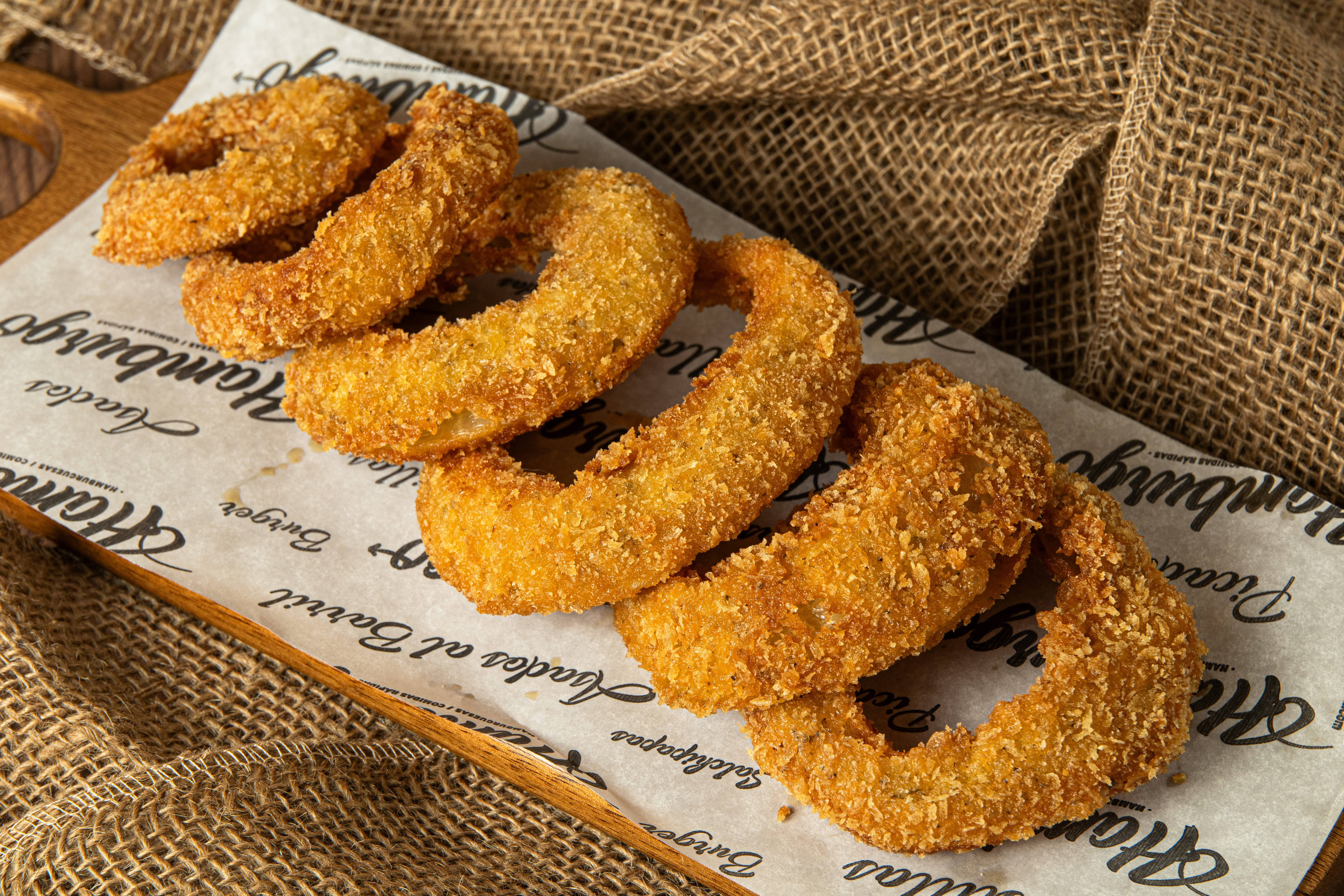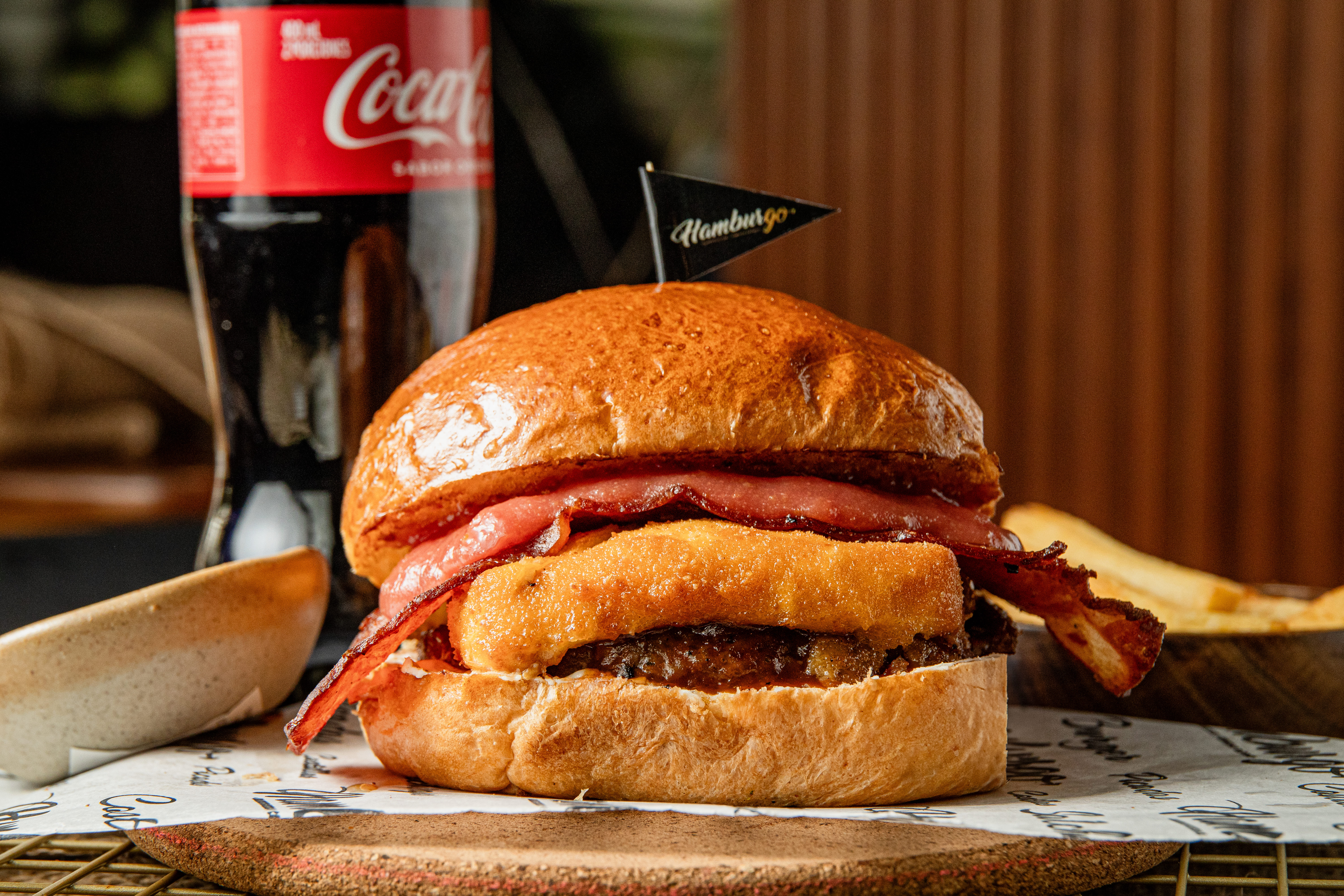 Doble carne artesanal, tocineta crocante, aros de cebolla crocantes, queso mozzarella, queso cheddar, cebolla grilled.