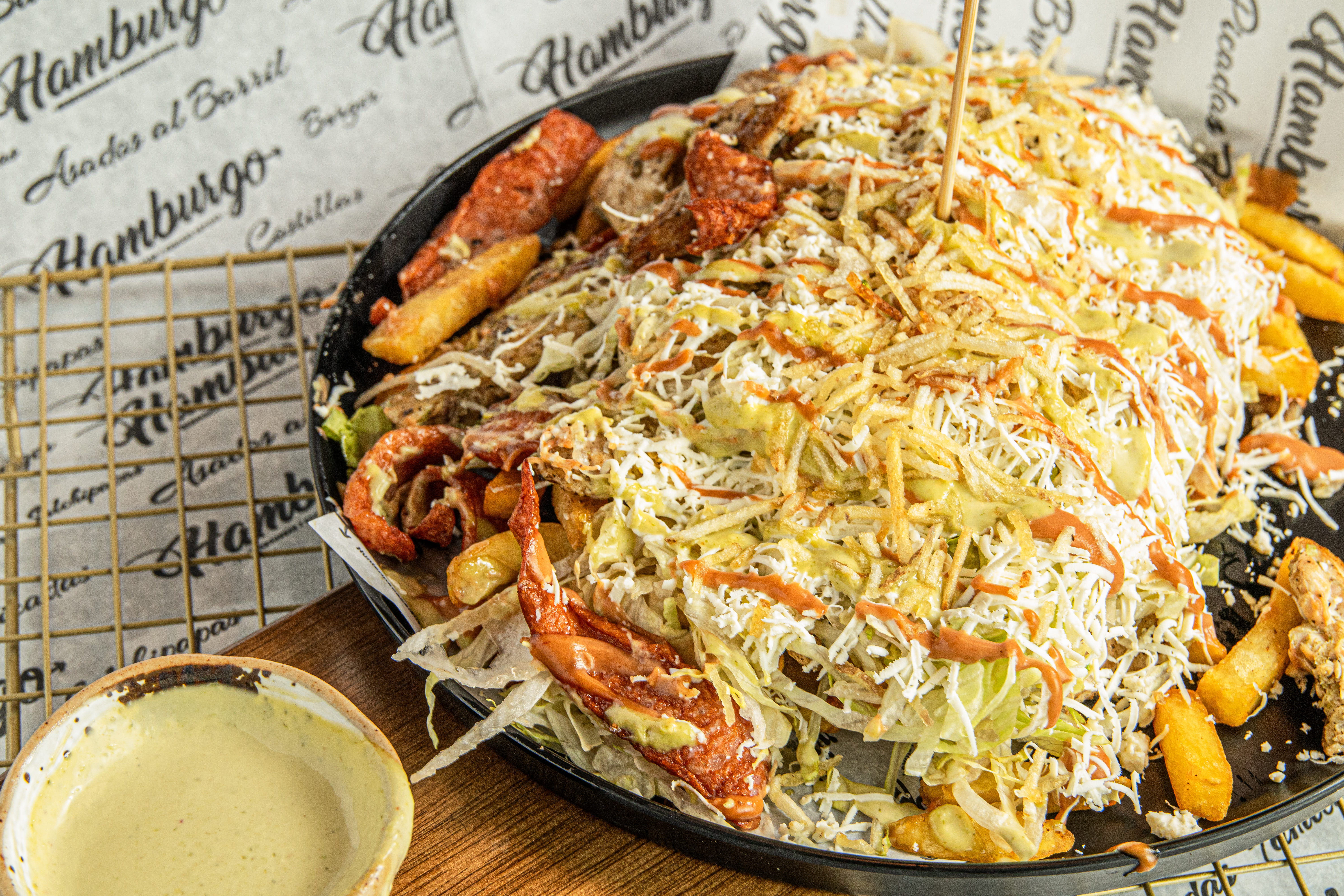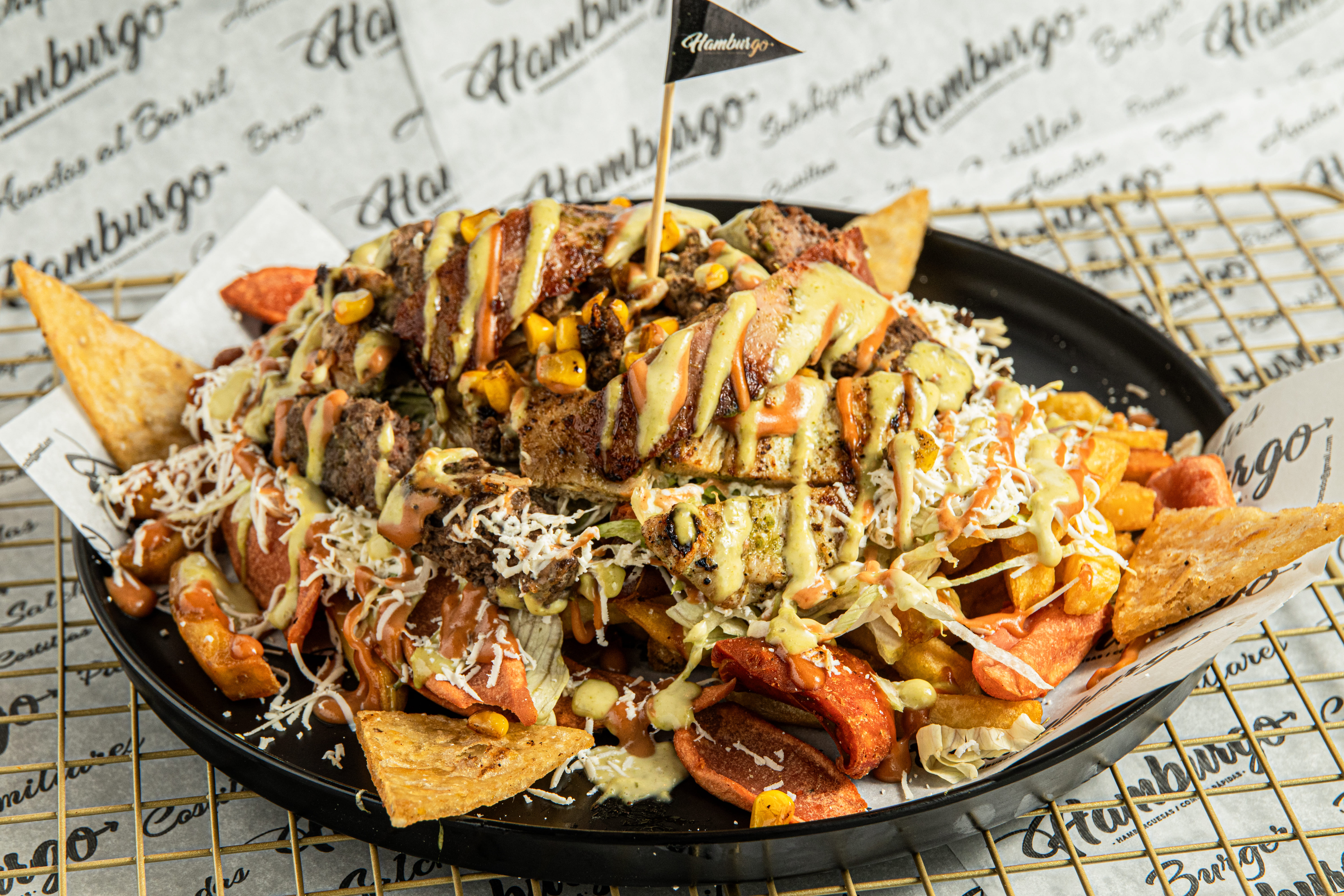 Carne de hamburguesa, pollo, chorizo, butifarra, salchicha, tocineta, chongo, lechuga, papas francesas, arepas crocantes, maíz tierno, queso costeño y salsa.