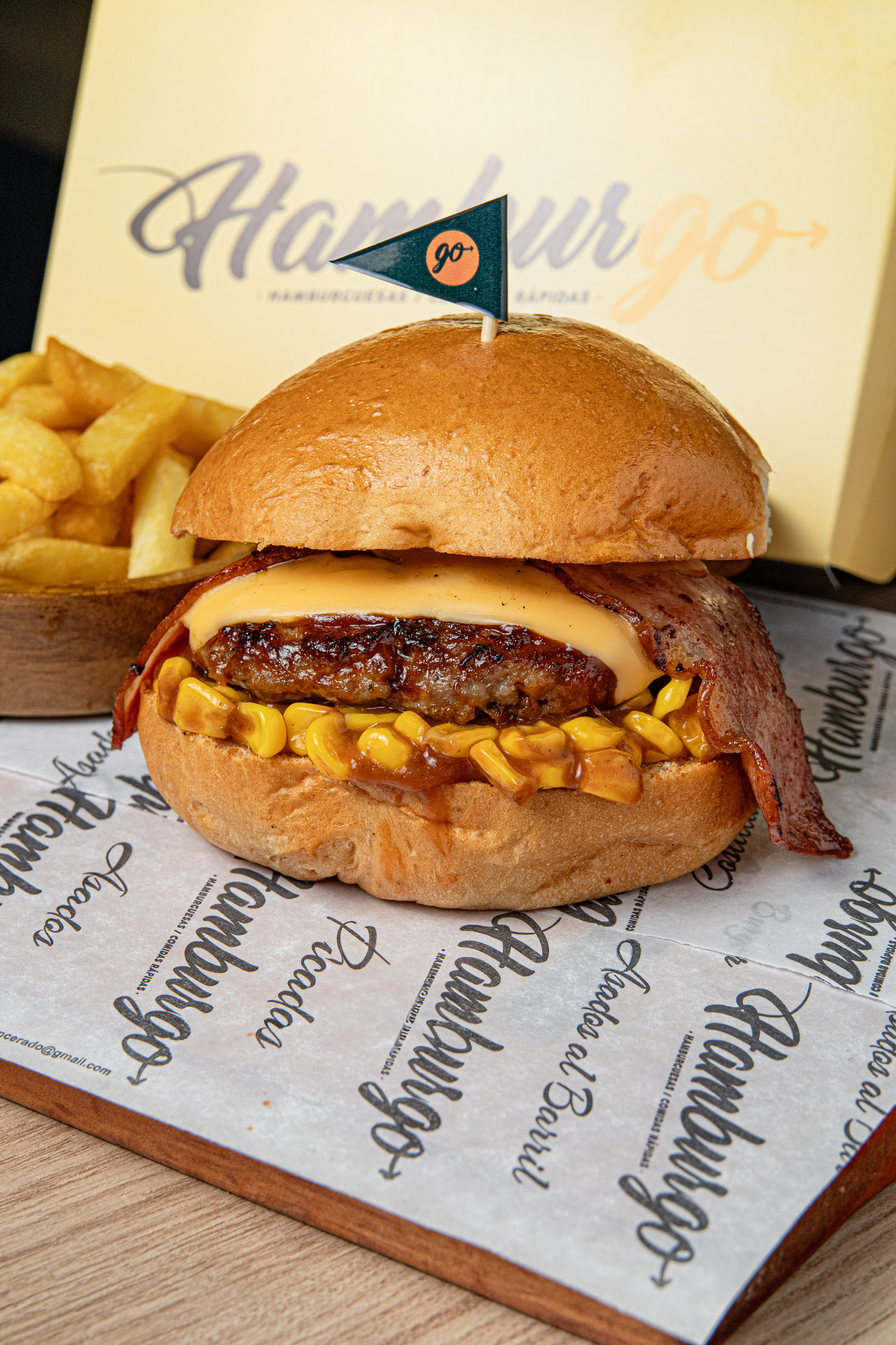 Carne de res, tocineta a la plancha, maíz tierno, queso cheddar y salsa.