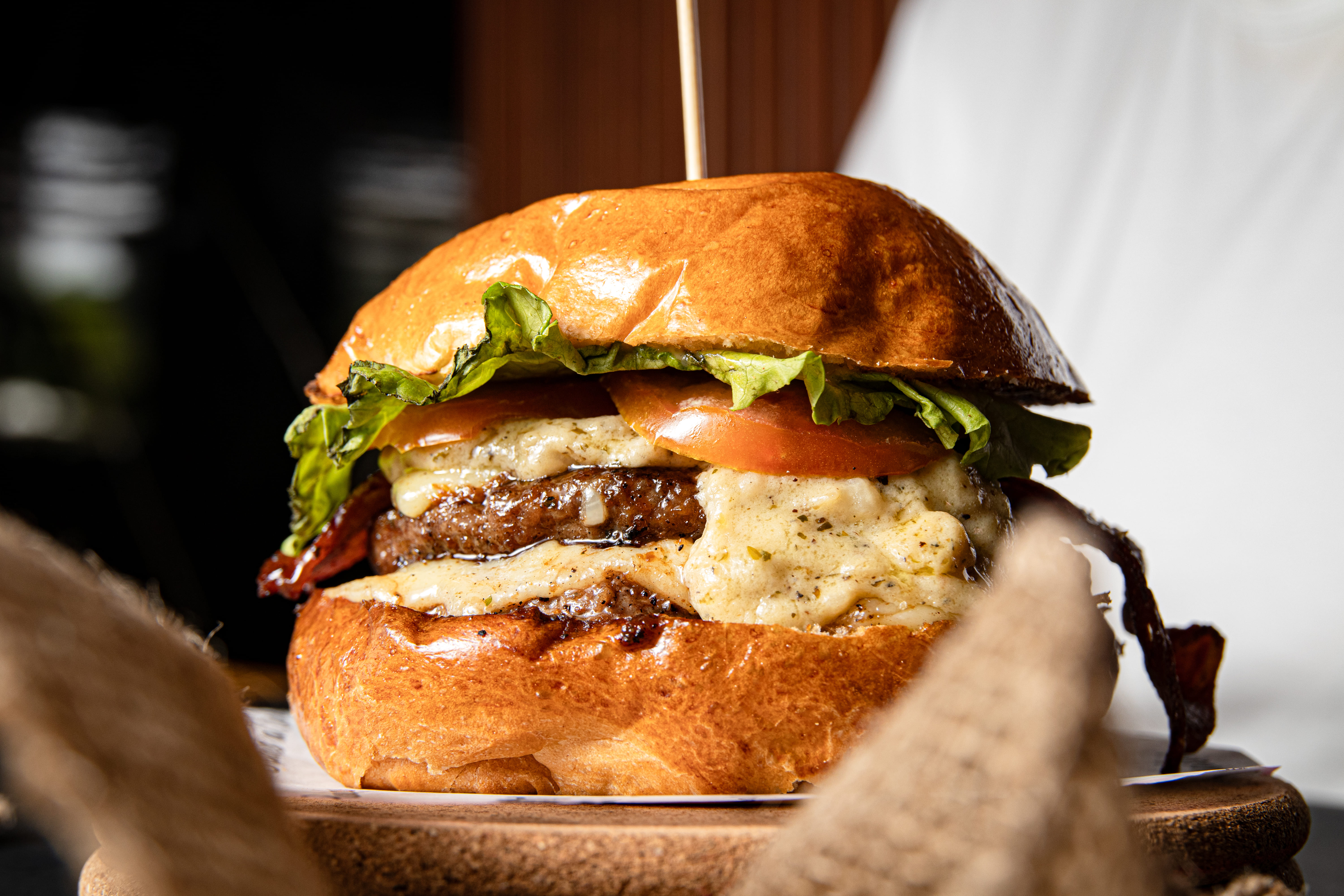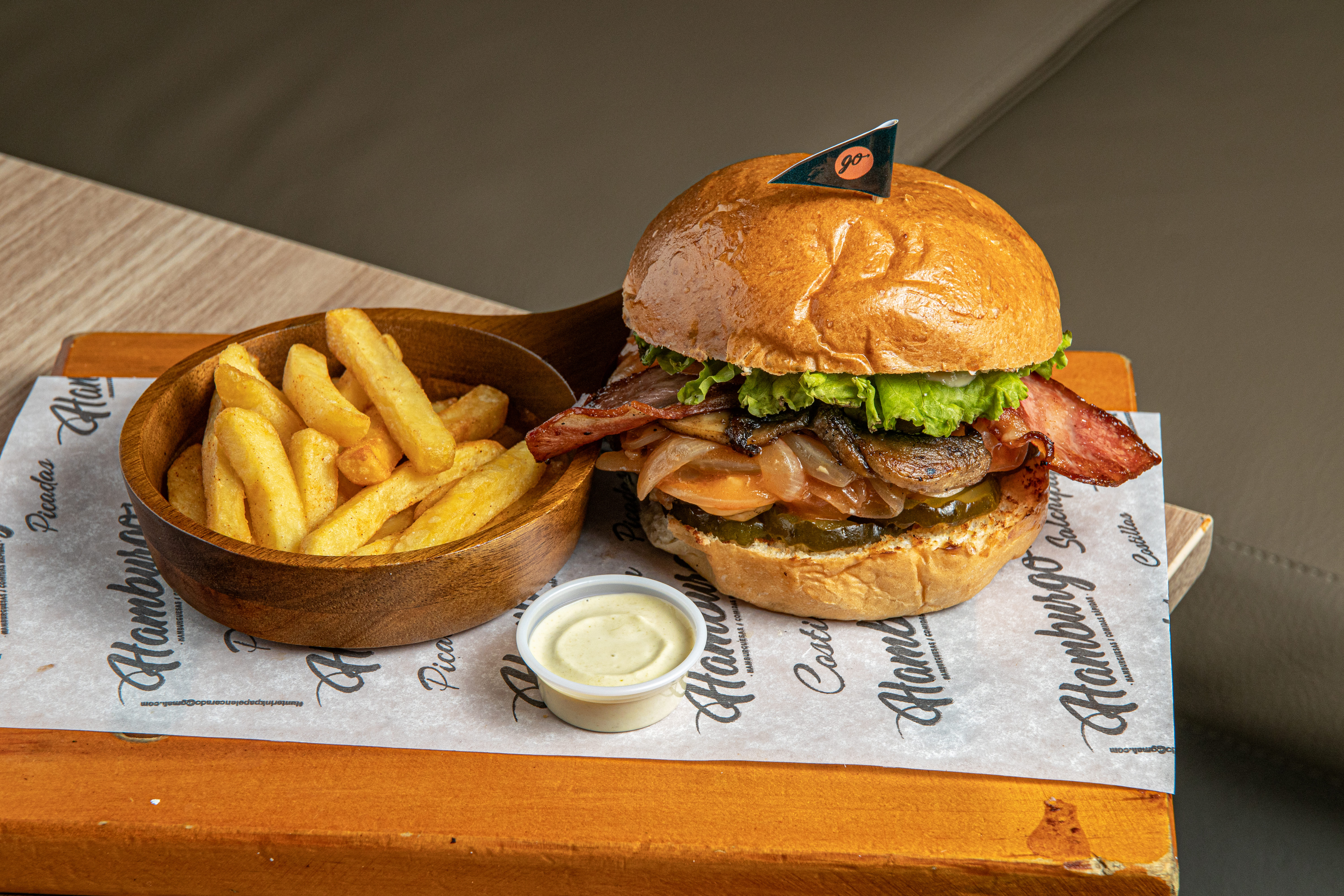 Doble carne artesanal, doble mozzarella, champiñones salteados a la plancha, tocineta en salsa bechamel, lechuga, tomate y salsa de la casa.