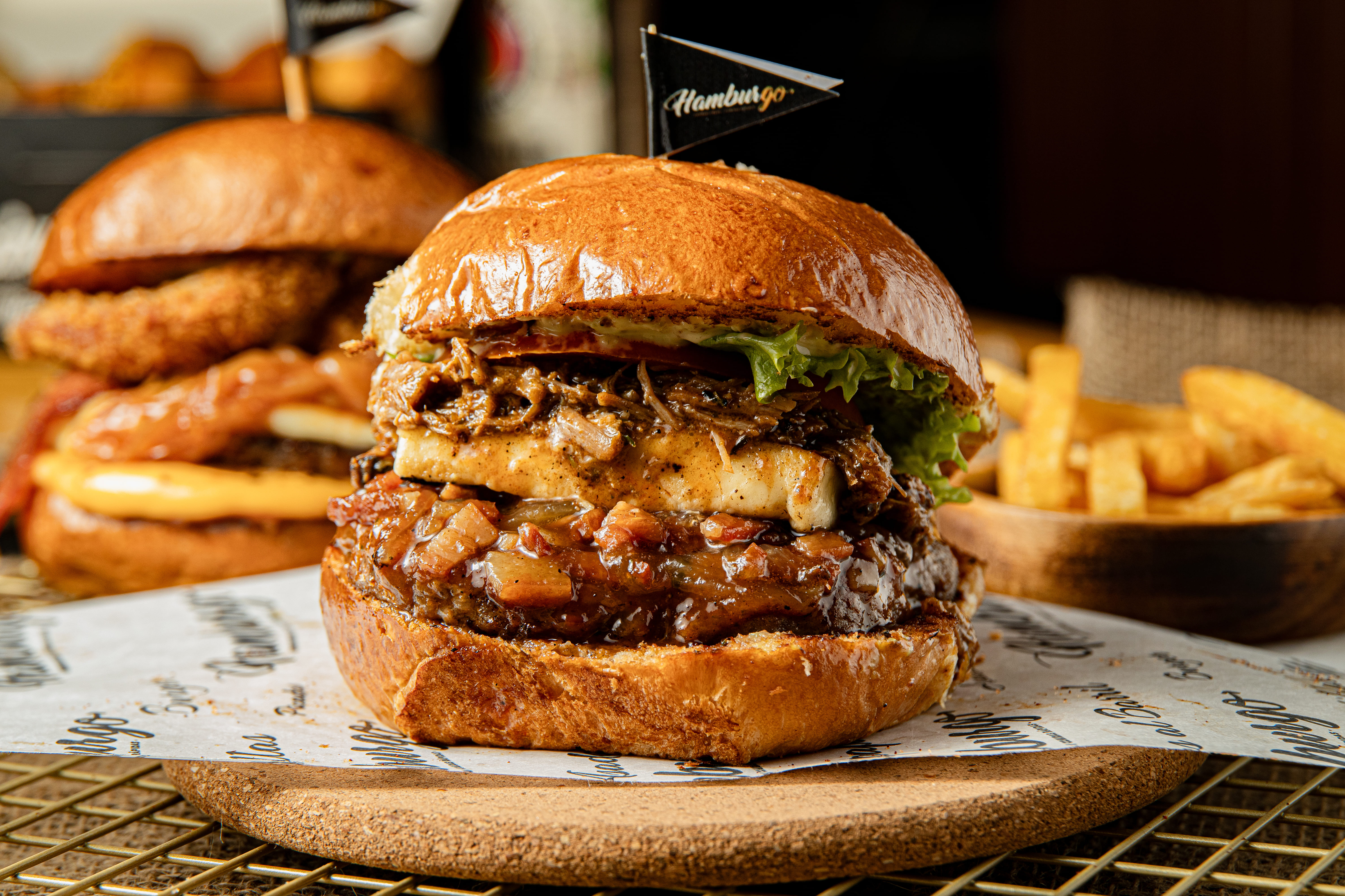 Carne de res, pulled pork, mermelada de tocineta, queso costeño asado, tomate, lechuga y salsa de la casa.