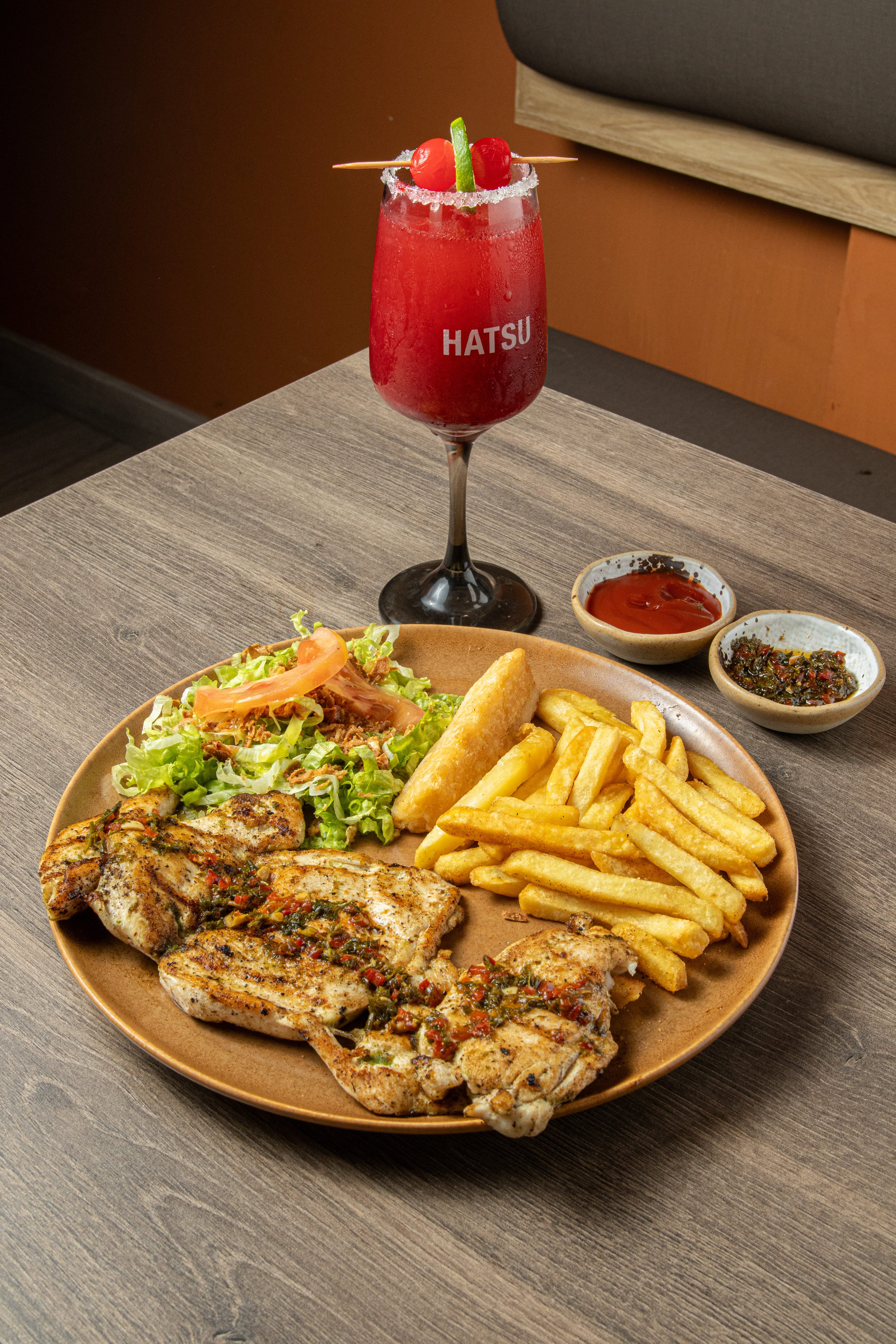 300 g De deliciosa pechuga asada acompañada de papas francesas, croqueta de yuca, ensalada, chimichurri y tártara.