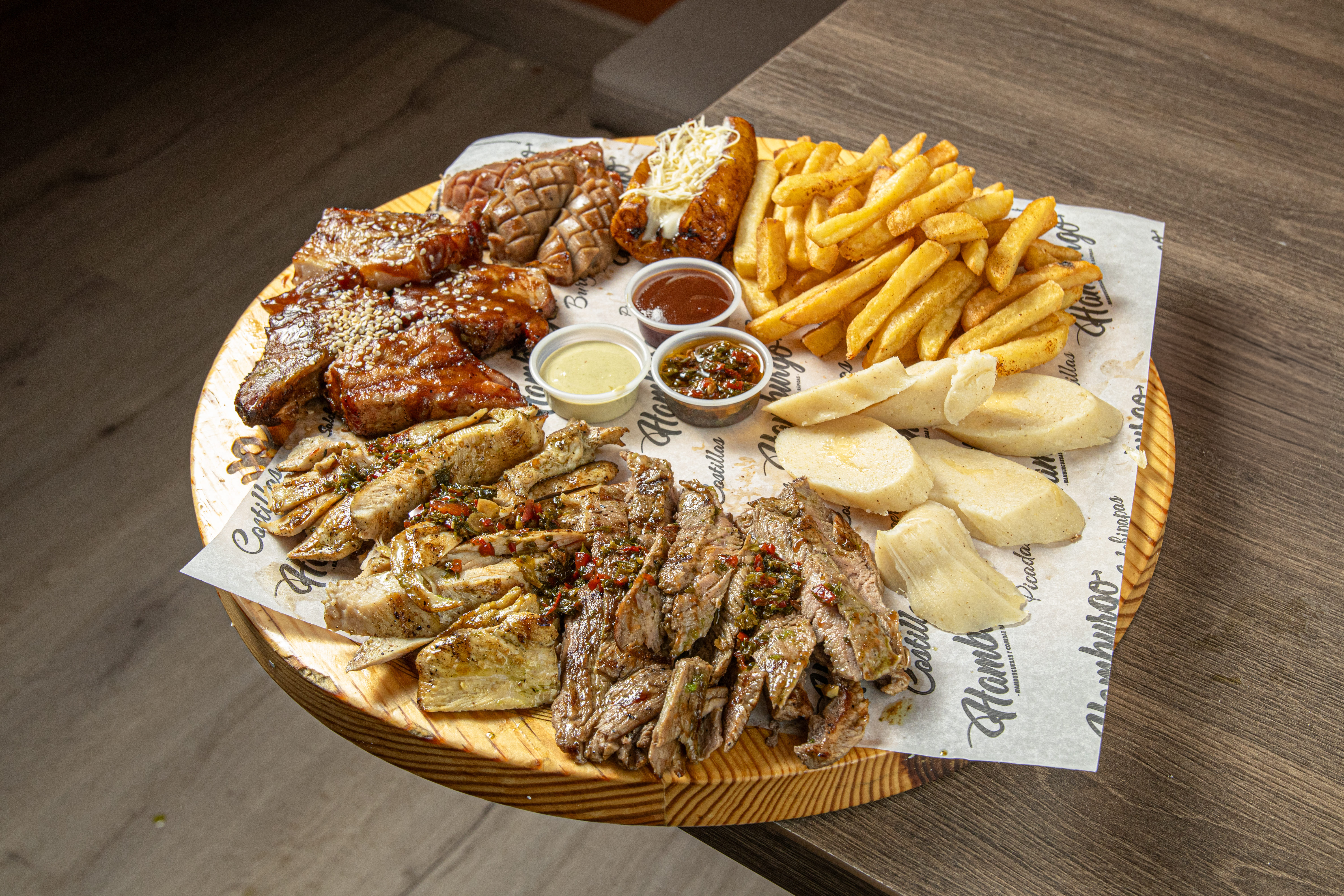 Lomo ancho, pollo, costillas al barril con salsa BBQ, chorizo santarosano, butifarra, plátano maduro con suero costeño, bollo de queso, papas francesas, chimichurri tropical y salsa tártara.