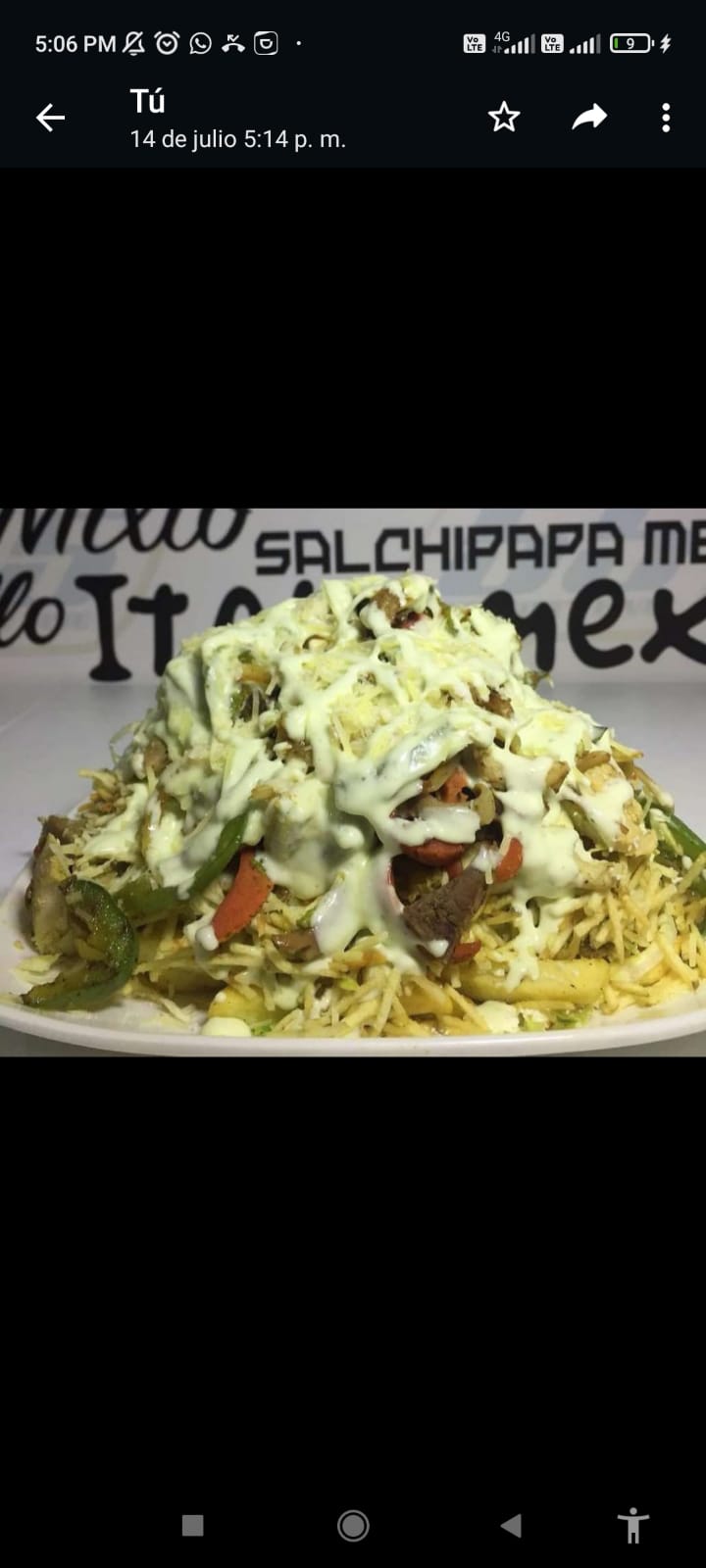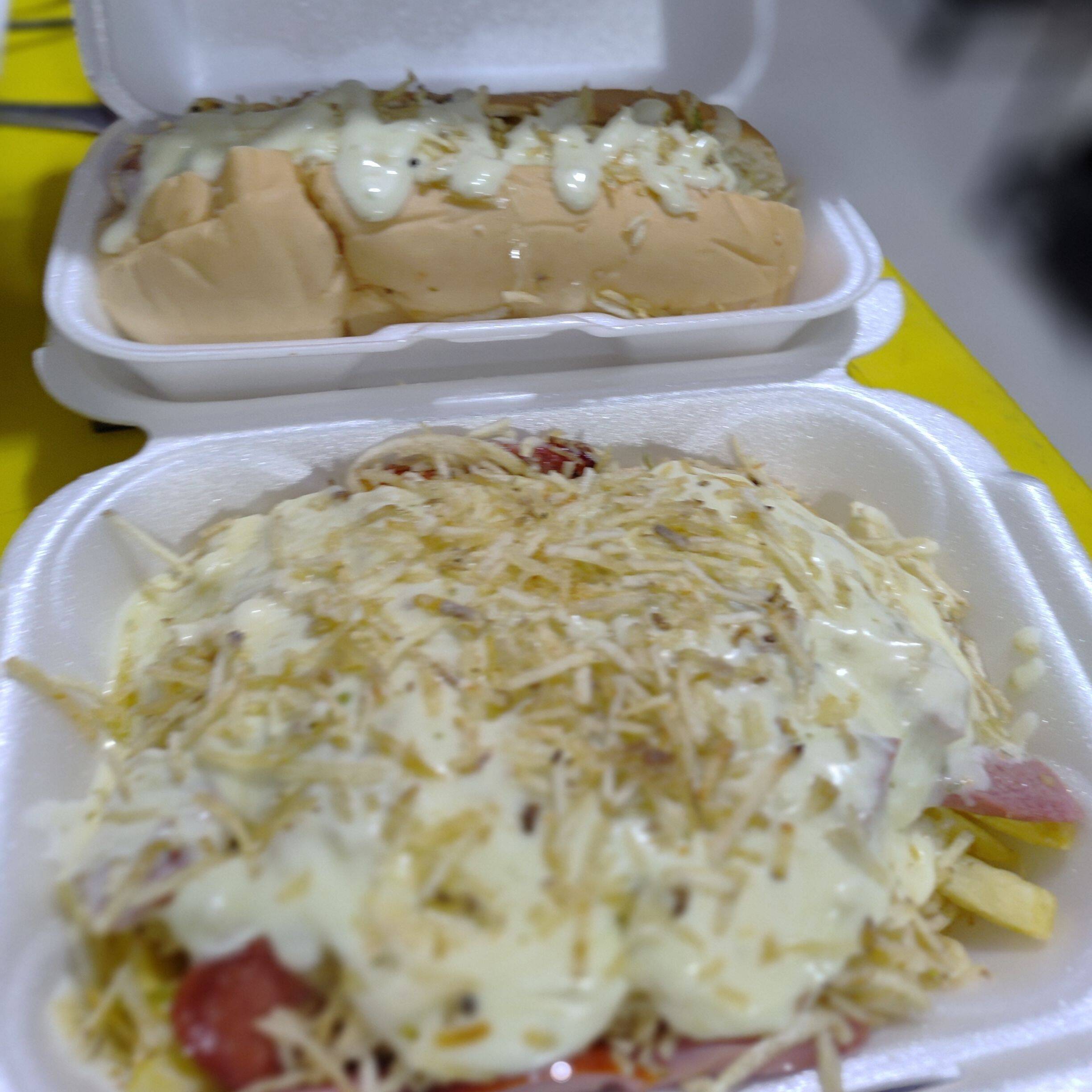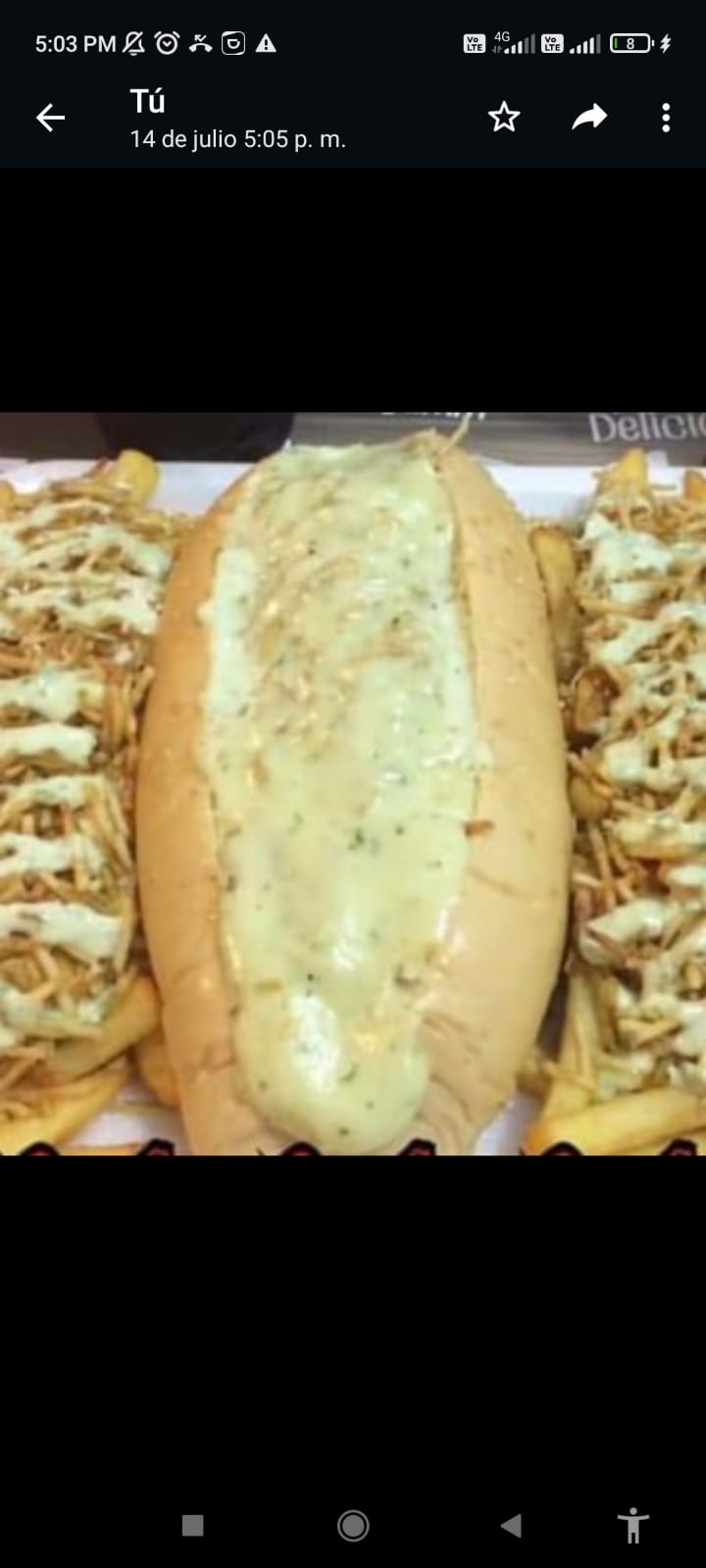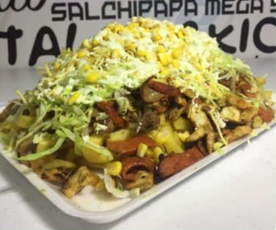 Papa, salchicha, lechuga, Chongo, queso mozarella y salsas de la casa.