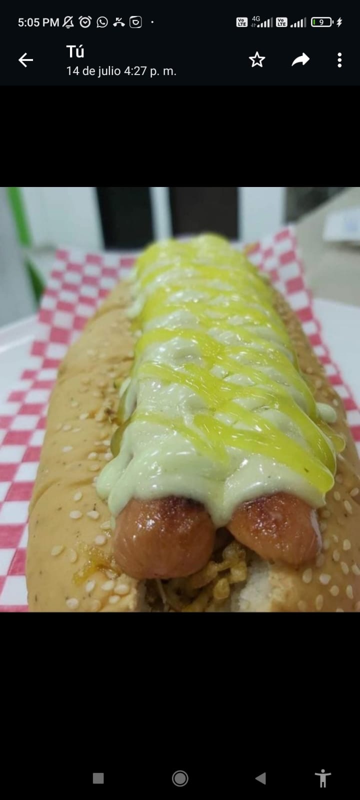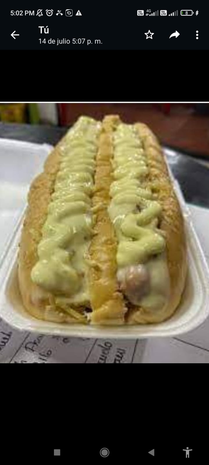 Pan súper, salchicha, queso, lechuga, chongo, salsa de la casa.