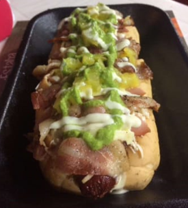 Perro suizo con tocineta jamón y mozarella + chimichurri y piña trocitos