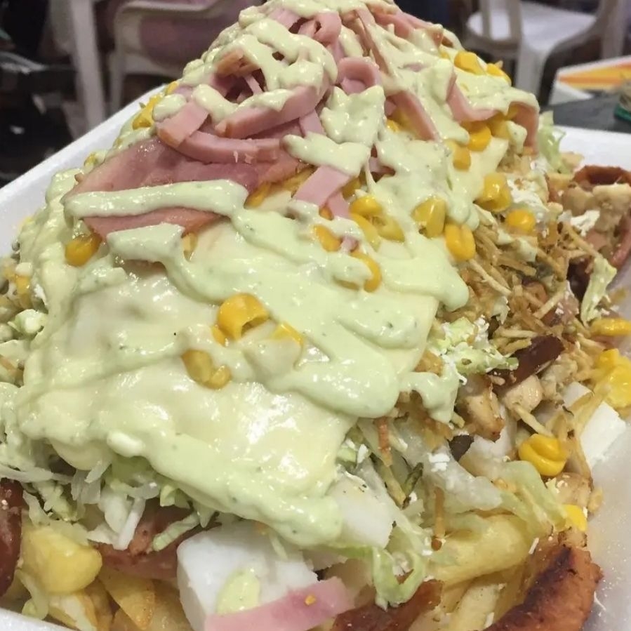 Papas francesas, pollo, chorizo, butifarra,, manguera, chongo, lechuga y salsa de la casa