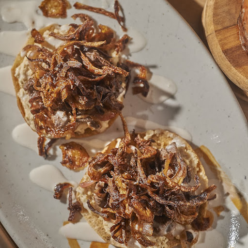 Carne Certified Angus Beef, hummus, queso fundido y cebolla caramelizada.