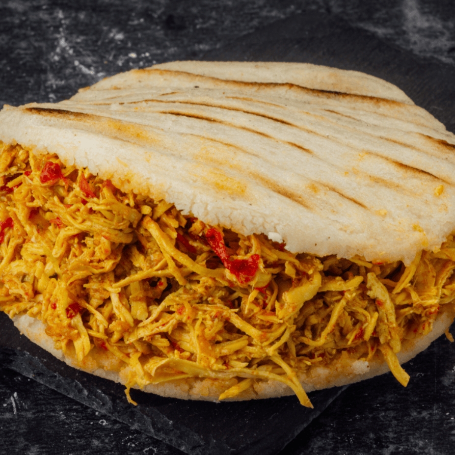 Jugoso pollo desmechado, sazonado a la perfección y servido dentro de una arepa recién hecha, cada bocado es una explosión de sabor, con la suavidad del pollo y la textura crujiente de la arepa, Ideal para los amantes de los sabores auténticos y reconfortantes. ¡Una delicia que te encantará!