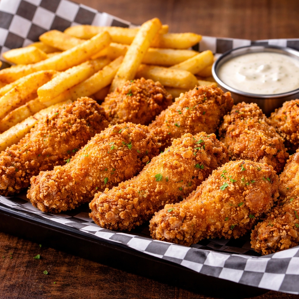 10 unidades: porción grande de crujientes alitas apanadas estilo broster, más papas francesas. ¡Una explosión de sabor!