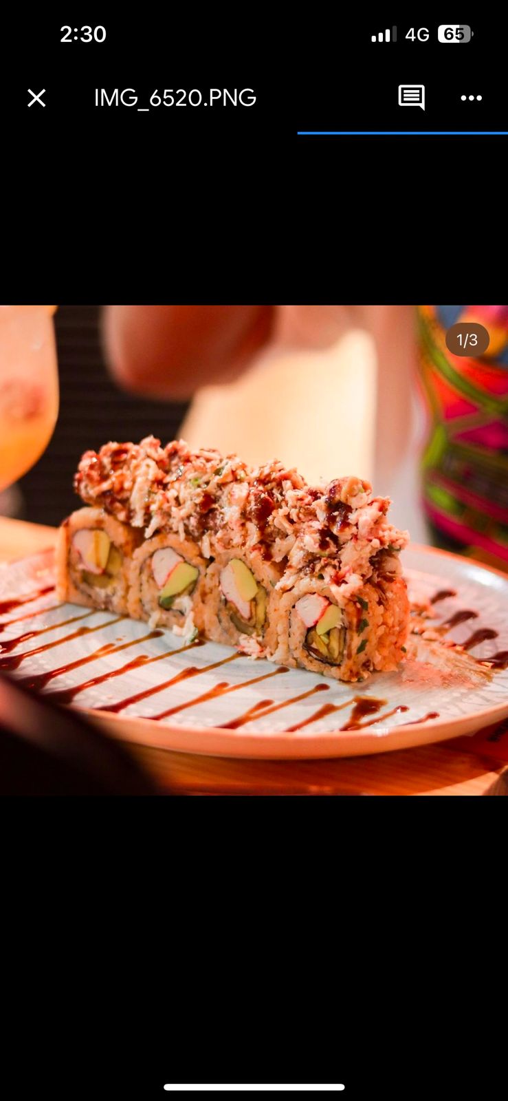 Camarón crunch, aguacate, queso crema, tope de camarones apanados acompañados con reducción de salsa dragón ligeramente picante, salsa teriyaki y ajonjolí.