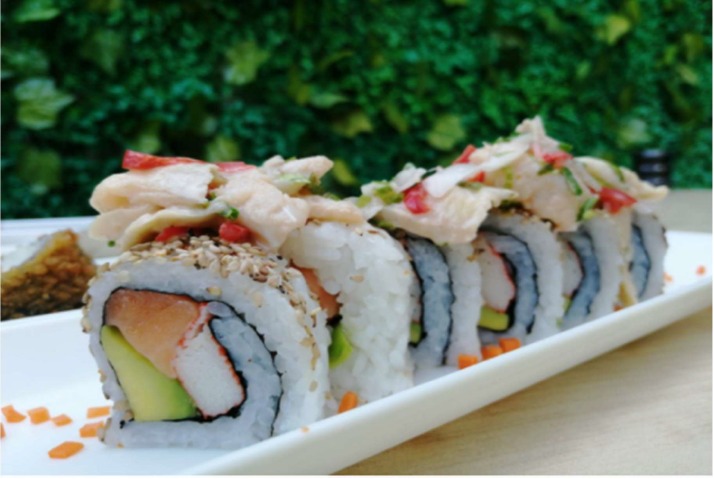 Relleno de ensalada dinamita, tope de cuatro sabores: tartar de salmón, ceviche de pescado, ensalada wakame y camarón crispy, bañado en salsa de la casa.