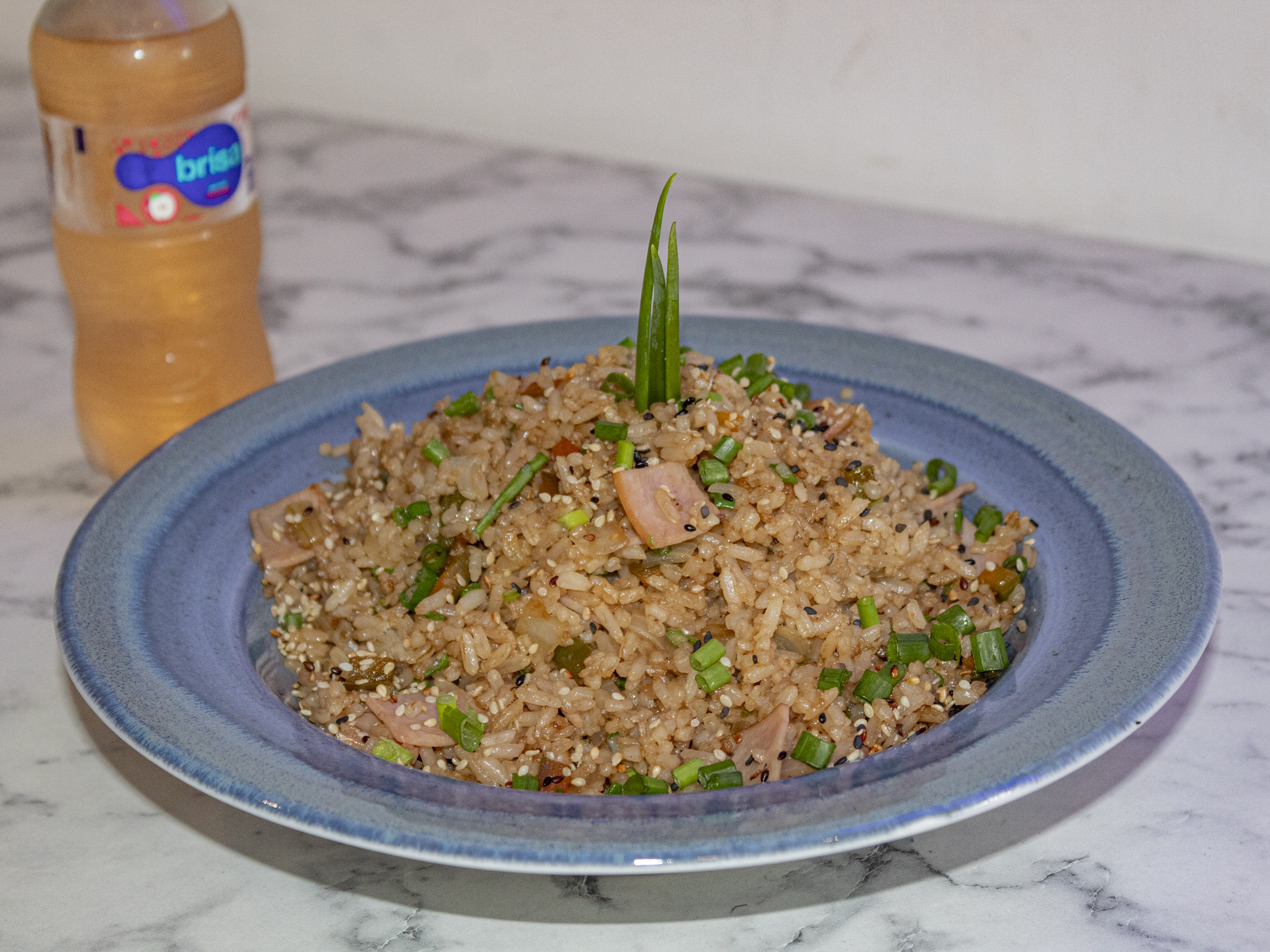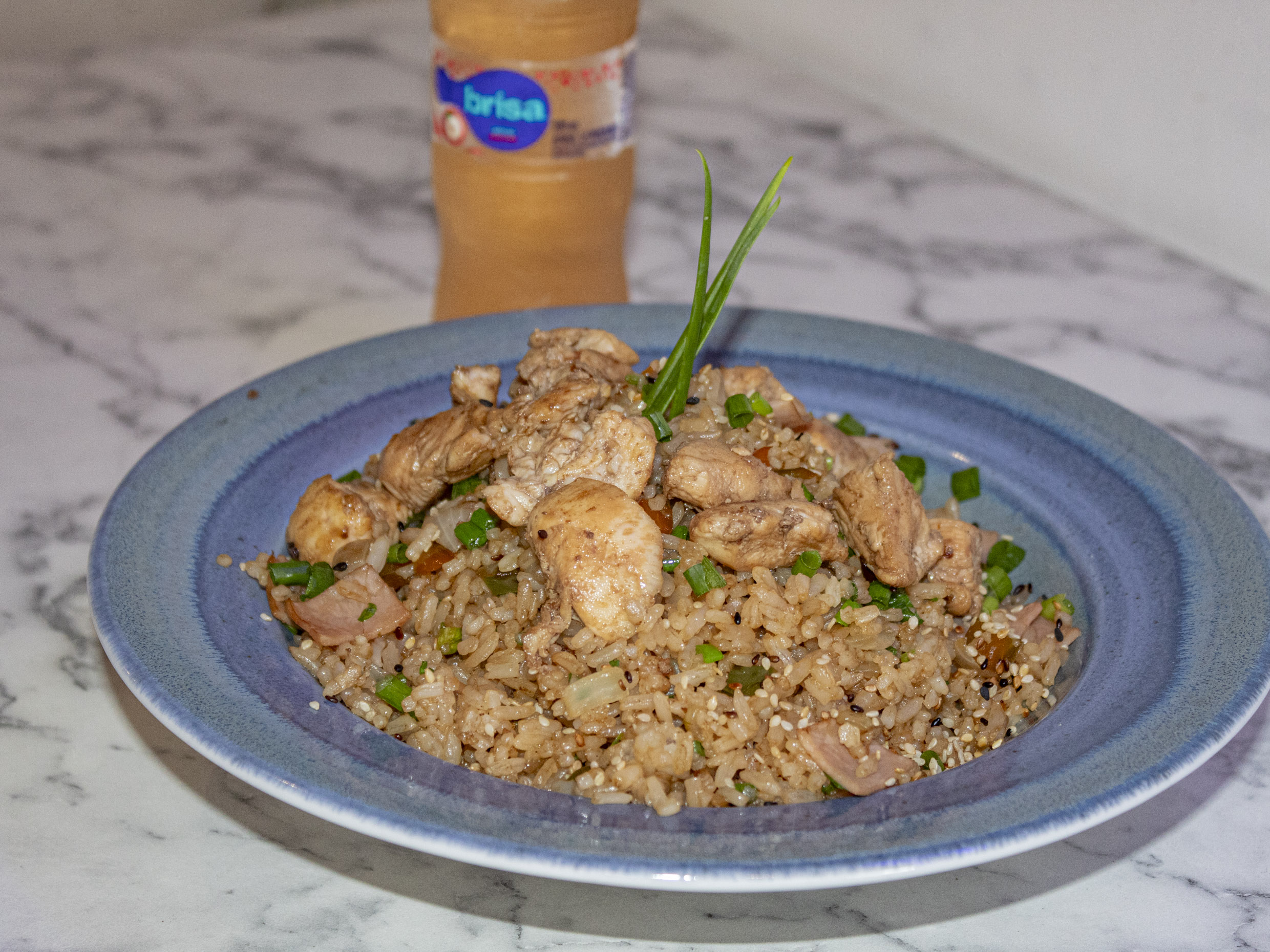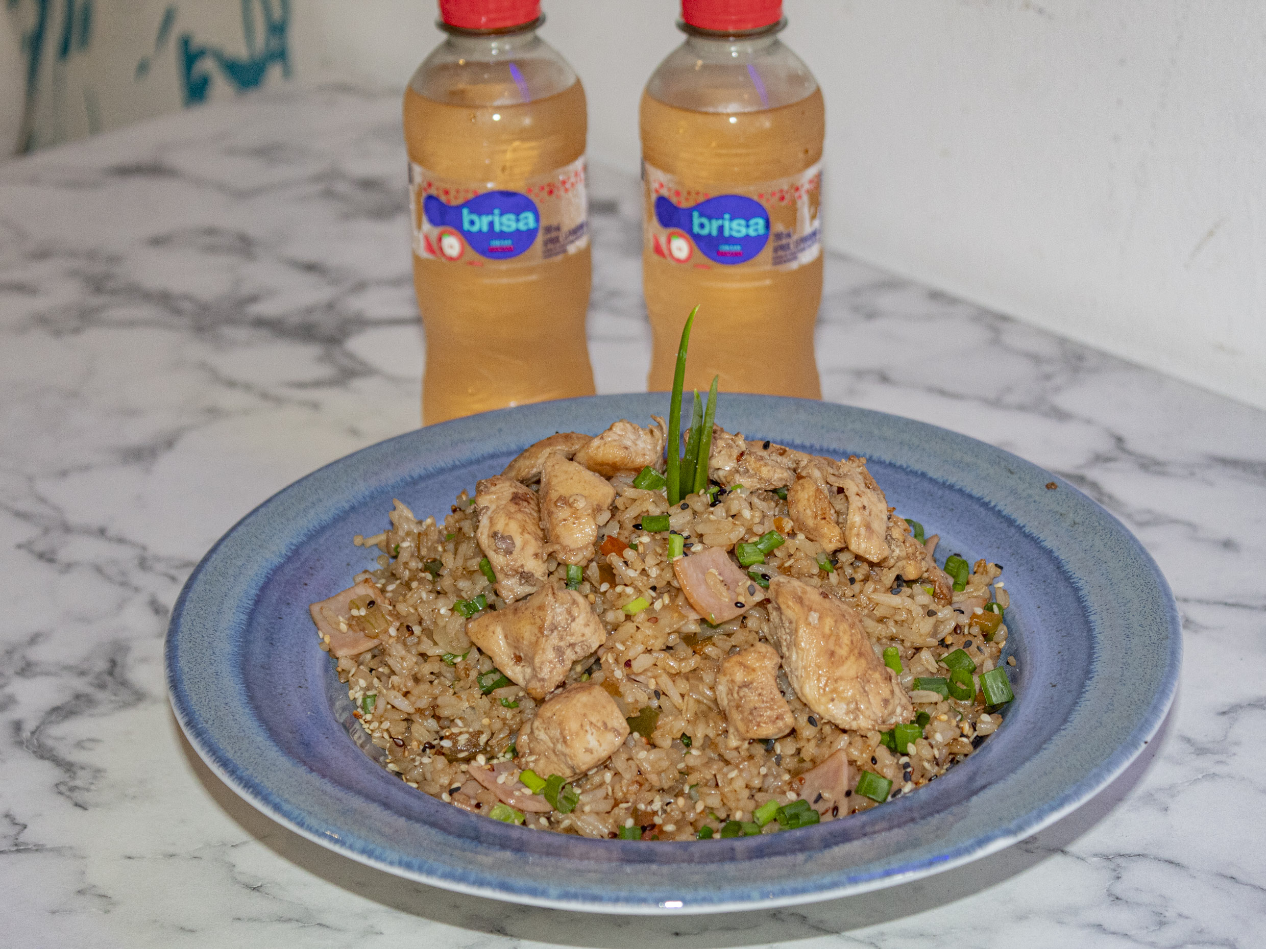 arroz frito salteado al wok con verduras frescas con pollo sazonado y jamon premium de primera calidad + bebida saborizada a manzana
