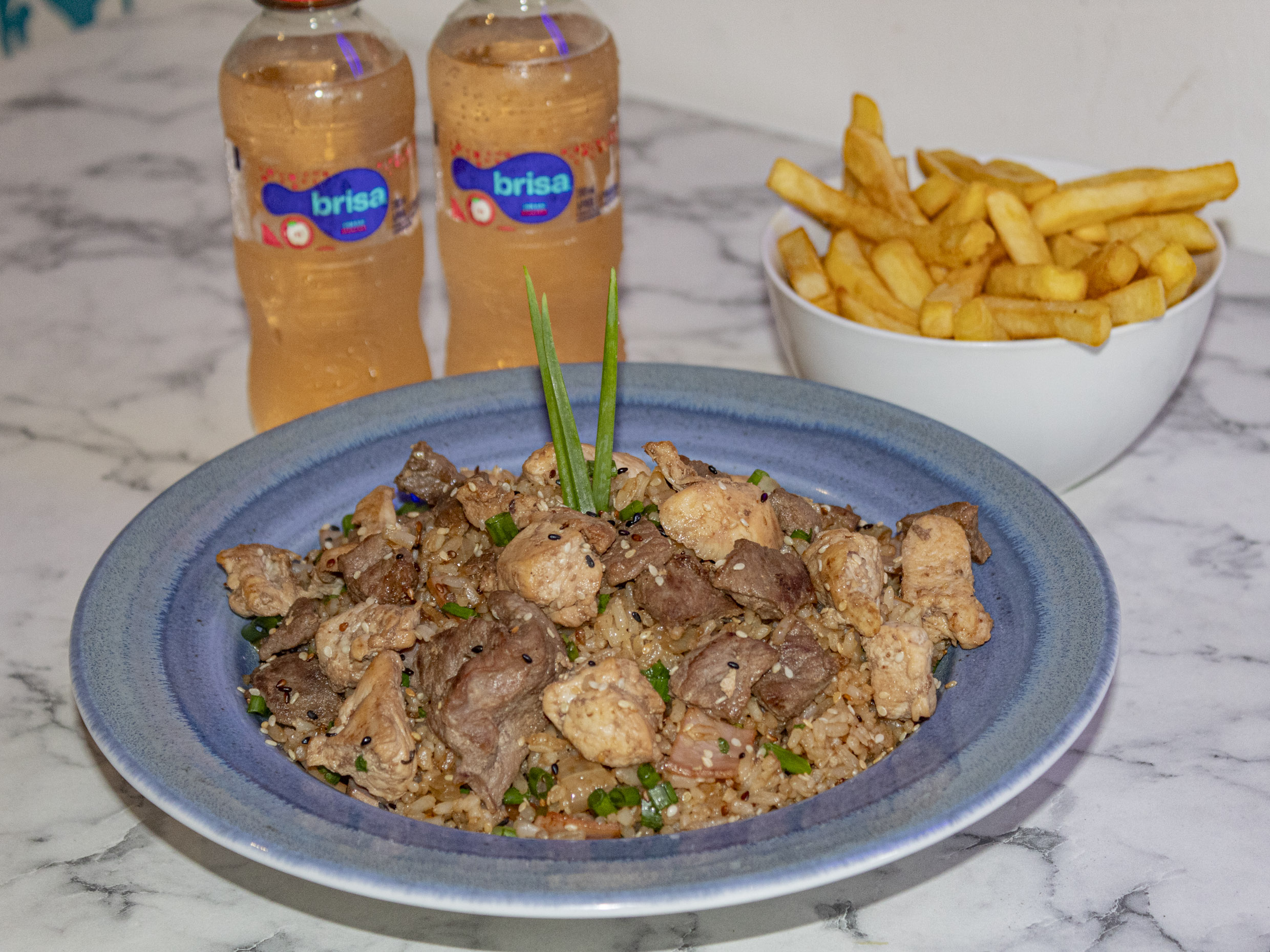 ARROZ MIXTO DOBLE , CON DOBLE PORCION DE PAPAS Y 2 BEBIDAS