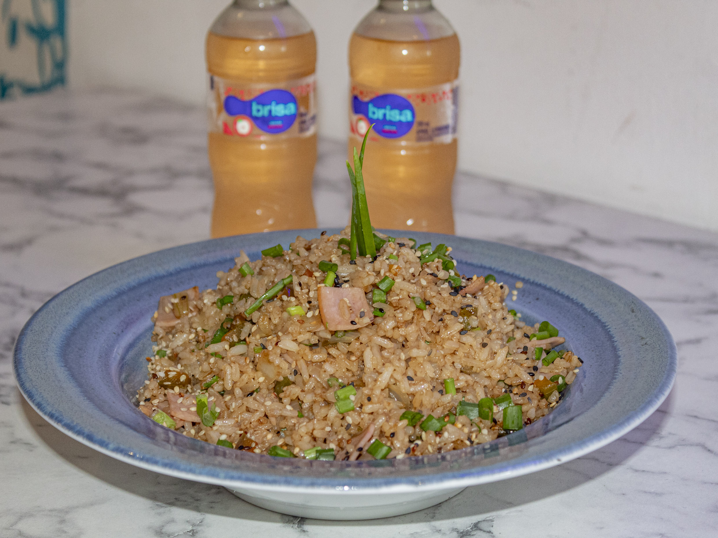 doble porcion de arroz frito salteado al wok con verduras frescas y jamon premium de primera calidad con dos bebidas saborizadas a manzana