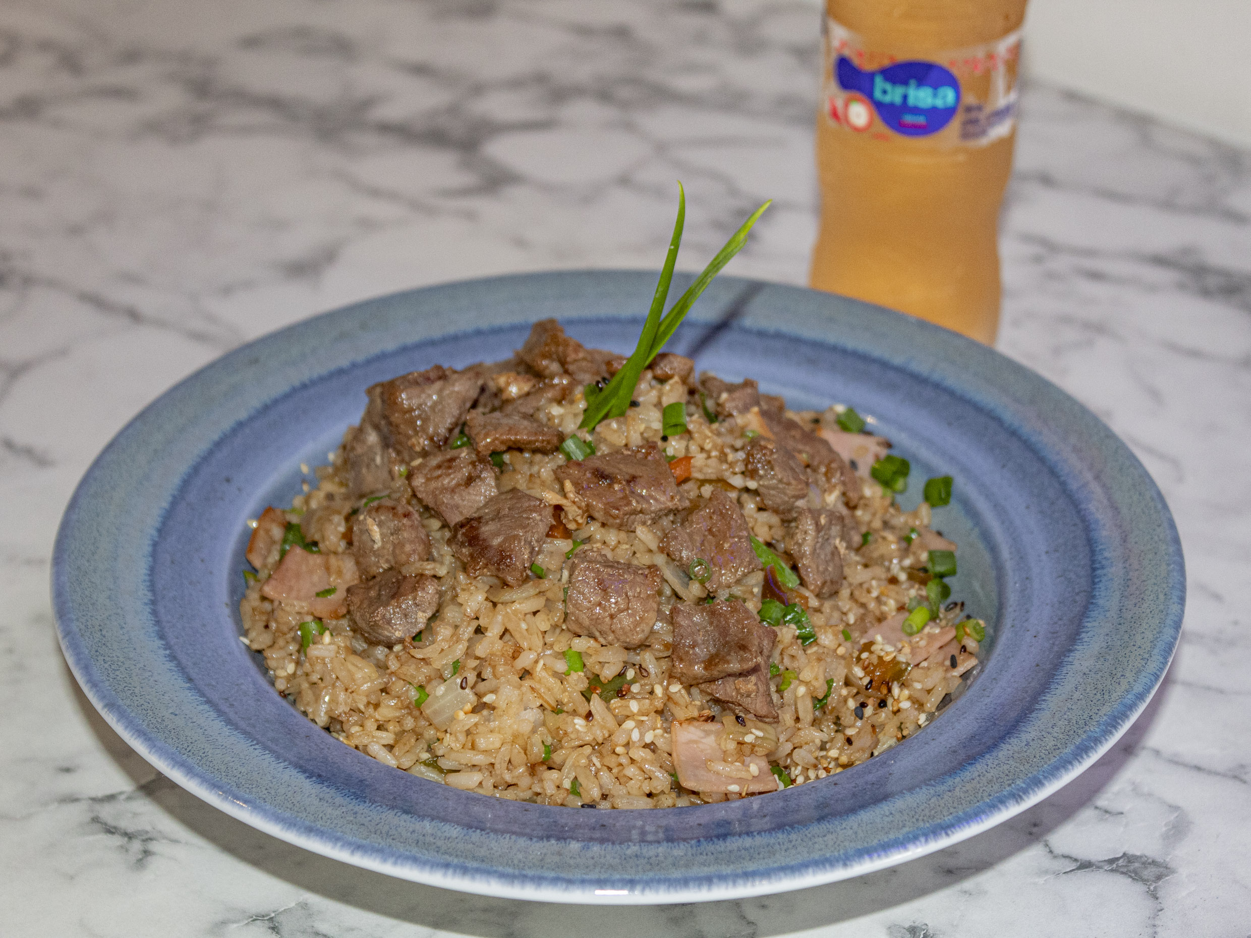 Arroz salteado al wok con verduras frescas salteadas y 3 proteinas de primera calidad, pollo carne y jamon.