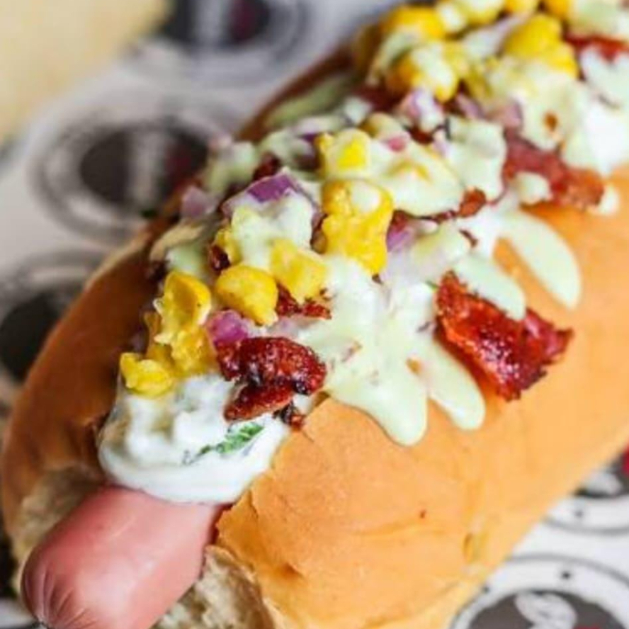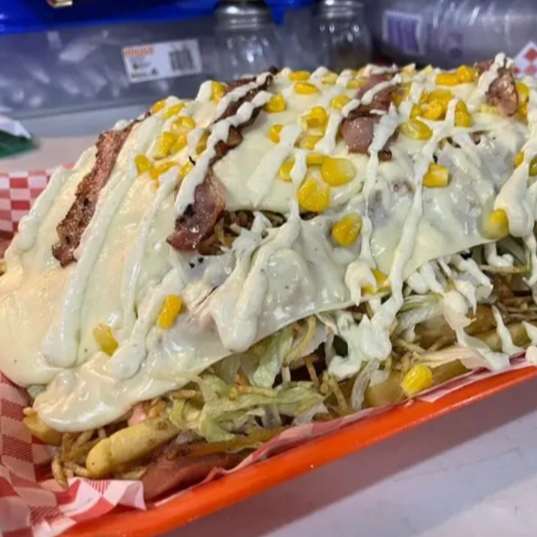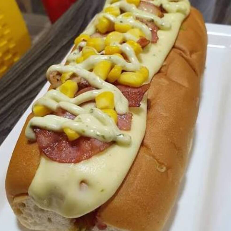 Doble salchicha vegetales gratinado jamón ripio salsa de la casa salsa piña