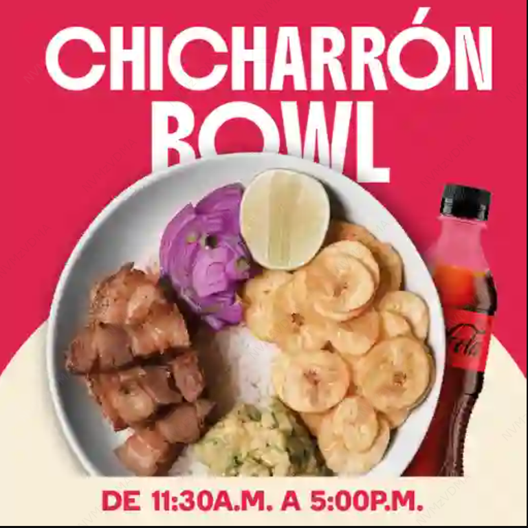 Bowl con arroz blanco, chicharrón crujiente, guacamole, cebolla encurtida y plátano verde, Coca Cola Zero 400 ml.