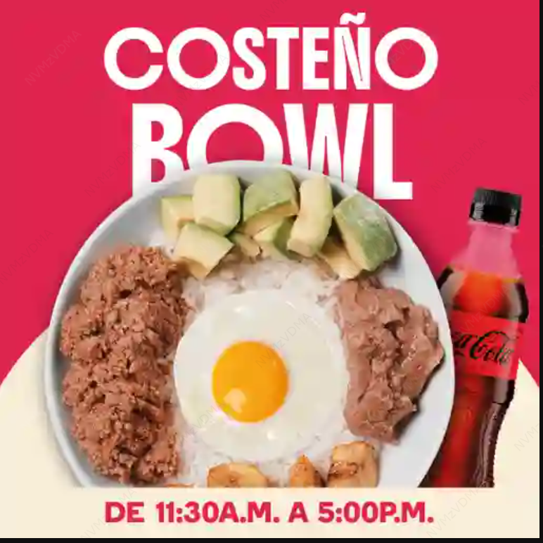 Bowl con arroz blanco, carne molida, aguacate en cubos, plátano maduro en trocitos, coronado con huevo frito, Coca Cola Zero 400 ml.