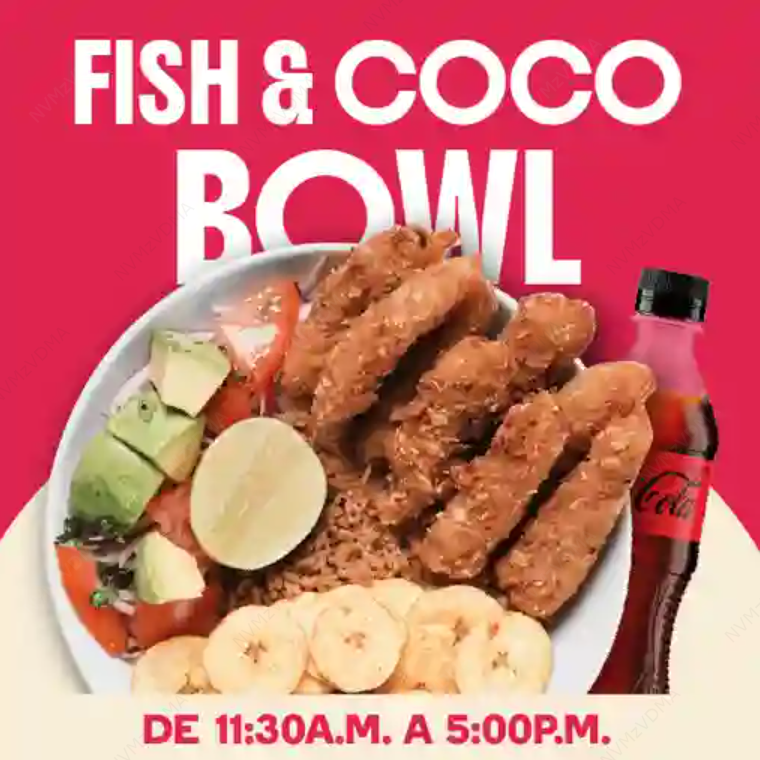 Bowl de arroz de coco con pescado blanco apanado, ensalada (aguacate, tomate, cebolla), plátano verde, limón, Coca Cola Zero 400 ml.