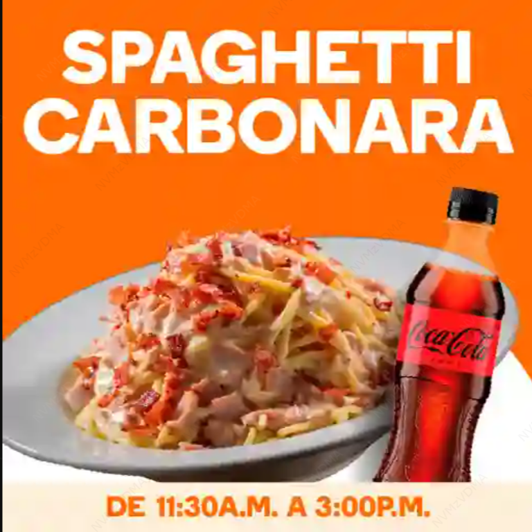 Pasta larga en salsa blanca con trocitos crocante de tocineta con perejil finamente picado, Coca Cola Zero 400 ml.